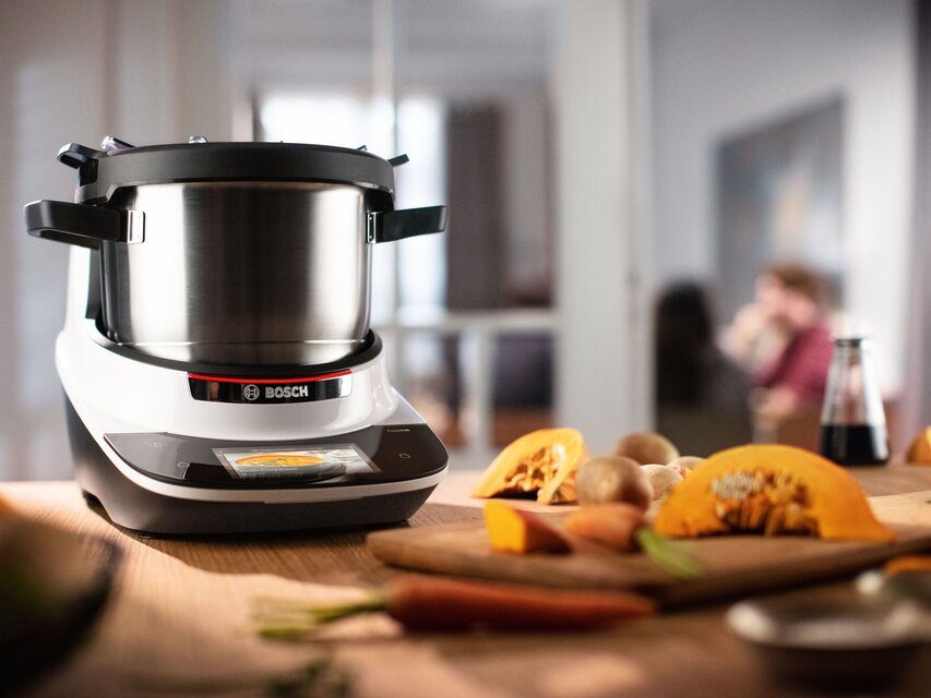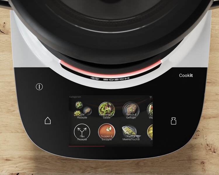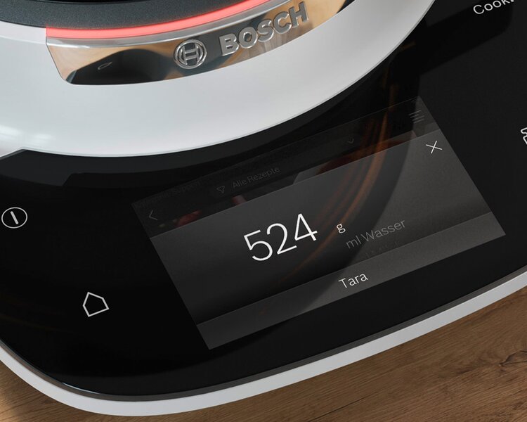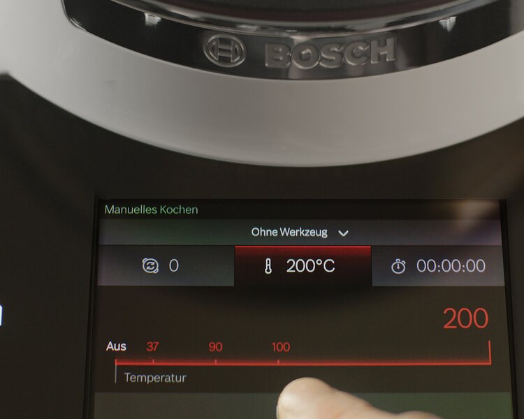 Das 5-Zoll-Touchdisplay ermöglicht eine einfache und komfortable Bedienung. Ein LED-Temperaturindikator über dem Bosch-Logo signalisiert, sobald der Topf aufgeheizt ist, während ein Temperaturmesser auf der Rückseite die Temperatur kontinuierlich überwacht. Die Verarbeitung wirkt hochwertig und robust – nichts wackelt oder knarzt.