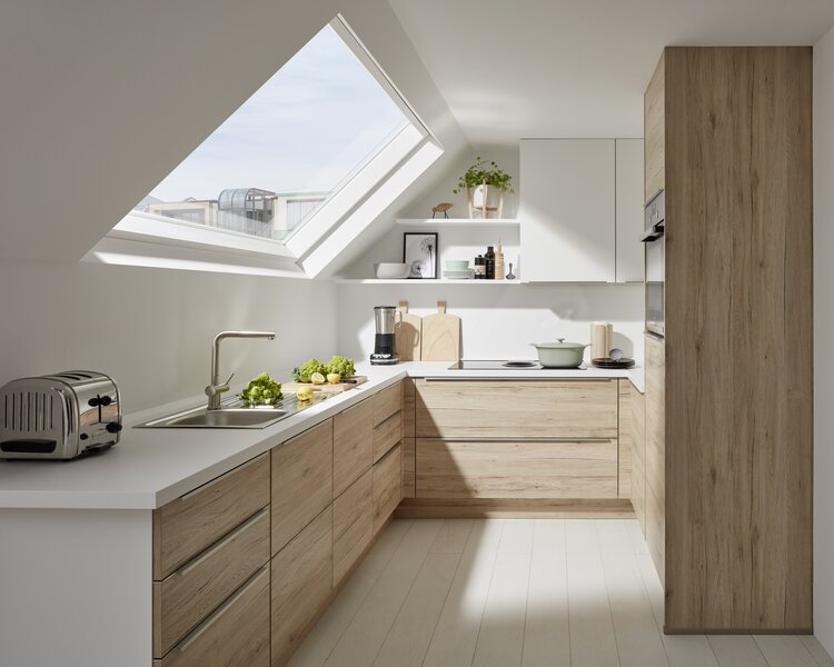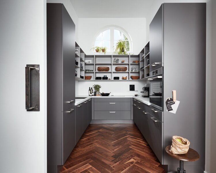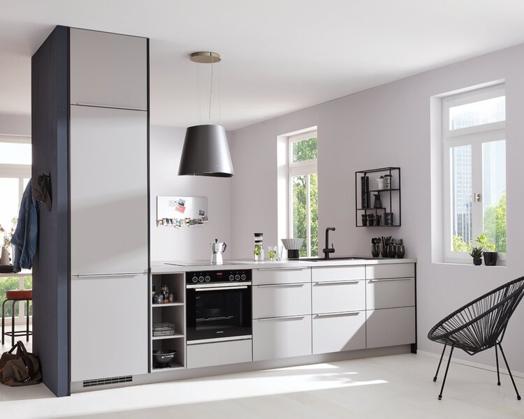 Plane hoch: Vielleicht hast Du nicht viele Meter auf dem Boden, aber dafür jede Menge Raum an der Wand? Dann nutze diese wertvolle Fläche und plane nach oben! Du kannst hohe Oberschränke wählen, mehrere übereinander platzieren oder zusätzlich Regale anbringen, um den Platz optimal zu nutzen. So verwandelst Du den vertikalen Raum in eine wertvolle Fläche, die Deine kleine Küche deutlich größer wirken lässt.