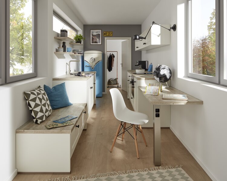 Tausche Groß mit Klein! Der Geschirrspüler gibt es auch in einer schmaleren Variante, und auch das Spülbecken muss nicht riesig sein. Mit kleineren Ausführungen kannst Du wertvollen Platz gewinnen. Vielleicht kannst Du auch auf einen großes Kochfeld verzichten und stattdessen ein kompaktes Dominokochfeld mit zwei Kochzonen wählen. Den klassischen Backofen kannst Du durch eine Mikrowelle mit Backofenfunktion ersetzen, die Dir zusätzliche Flexibilität bietet. Auch der Kühlschrank nimmt oft viel Raum ein, der anderweitig dringend benötigt wird – hier ist eine kleinere Variante, die unter die Küchenzeile passt, eine clevere Lösung. So schaffst Du in Deiner kleinen Küche viel mehr Platz, ohne auf wichtige Funktionen verzichten zu müssen.