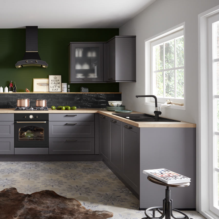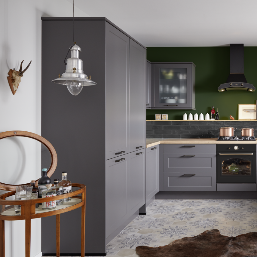 Diese Küche ist der Inbegriff von britischem Landhaus-Charme und verbindet traditionelle Gemütlichkeit mit modernem Stil. Der zentrale Star ist der coole Gasherd, der mittig platziert perfekt in Szene gesetzt wird. Die schiefergrauen Küchenfronten schaffen dafür die ideale Bühne und lassen den Herd strahlen. Das satte Grün der Wand bringt einen frischen, urbanen Akzent ins Spiel, während die klaren Holzflächen warmen Kontrast bieten. Abgerundet wird die Landhausküche durch die dezente, aber zugleich charaktervolle Kachelleiste, die der Küche Struktur und Tiefe verleiht.