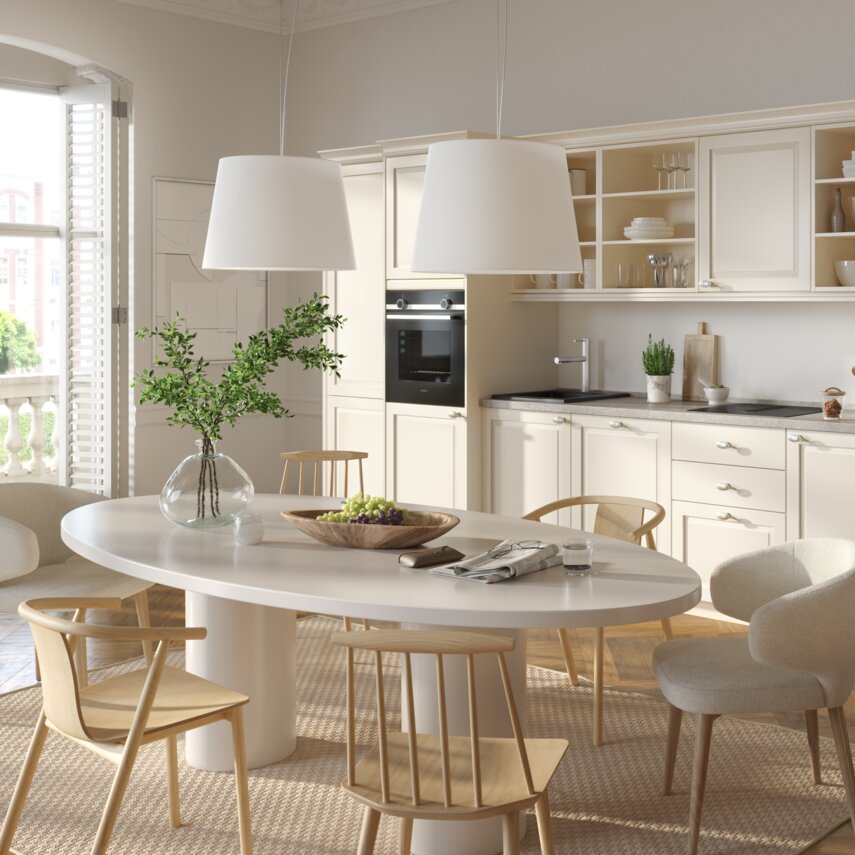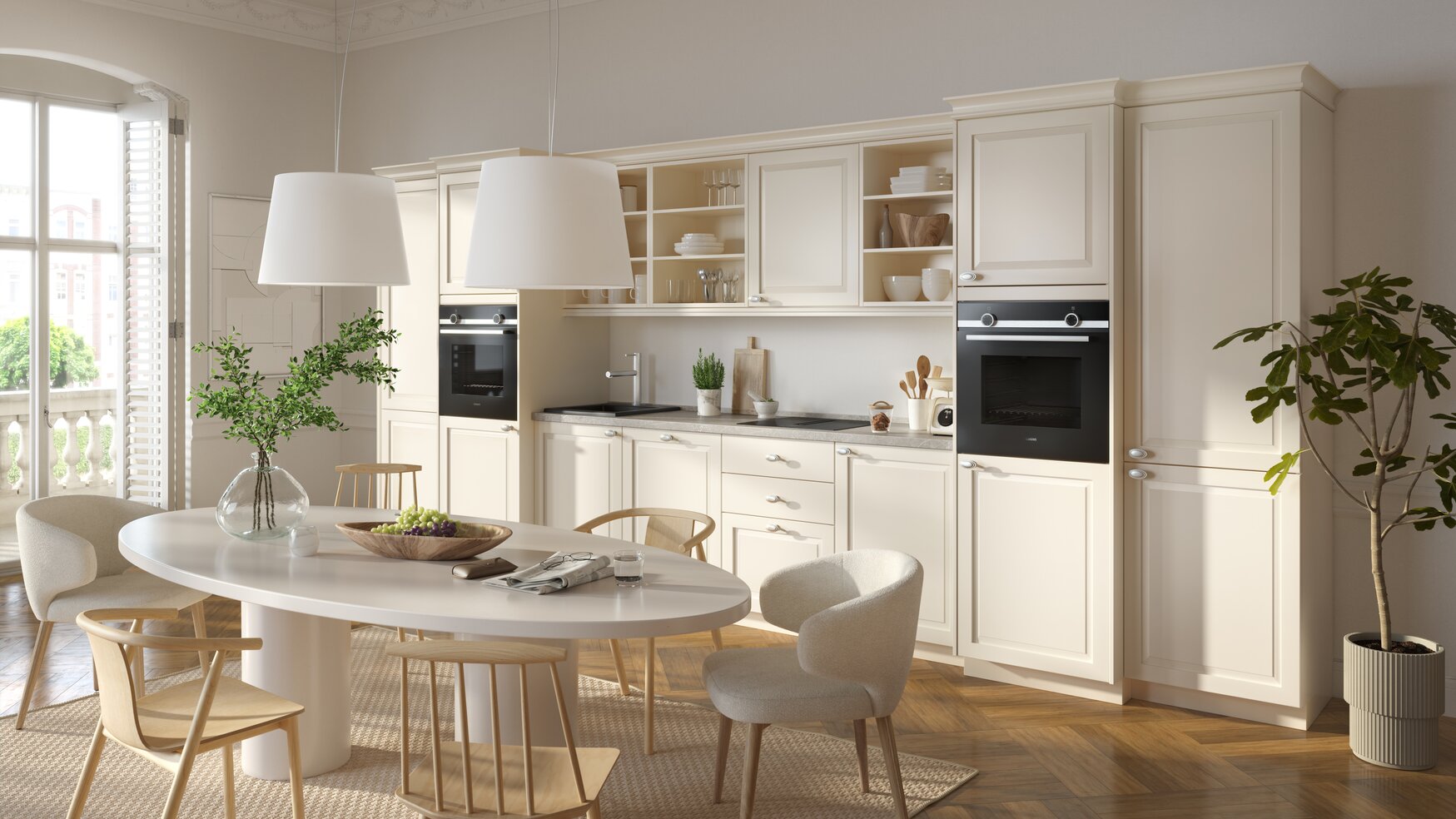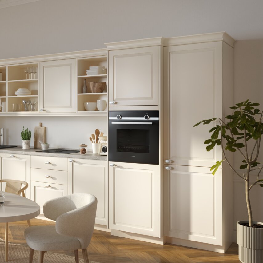Zeitlose Eleganz: Magnolia-Fronten und moderne Technik vereinen sich zur perfekten Landhausküche.