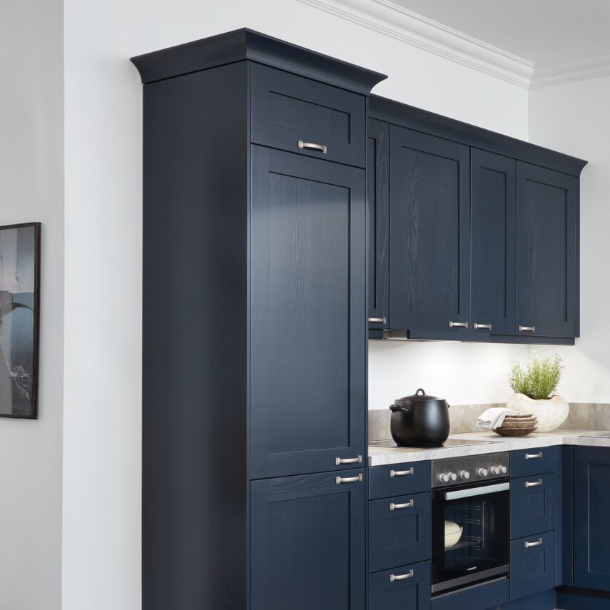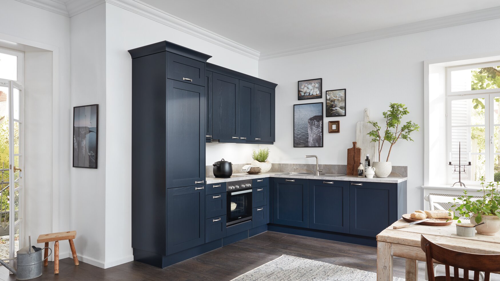 „Très chic“ möchte man dieser Landhausküche in Blau zurufen. Und noch viel mehr, weil sie auch gemütlich-rustikal und nordisch-urban ist. Eine äußerst gelungene Komposition, die französisches Flair versprüht. Die hohen Küchenschränke und die Auszüge bieten jede Menge Stauraum. Die Arbeitsplatte ist in heller Steinoptik gehalten und harmoniert perfekt mit den Vintage-Griffen. Landhaus-Charme à la Normandie.