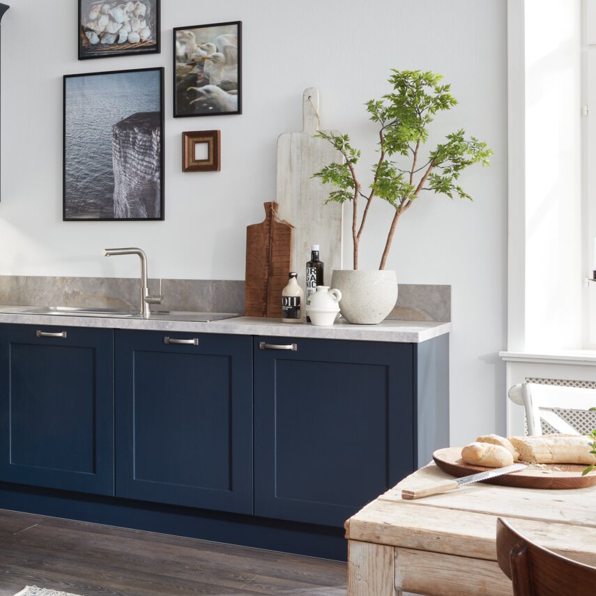 Blauer Landhaus-Chic: Französisches Flair mit Stauraum, heller Steinoptik und Vintage-Griffen für nordisch-urbane Gemütlichkeit.