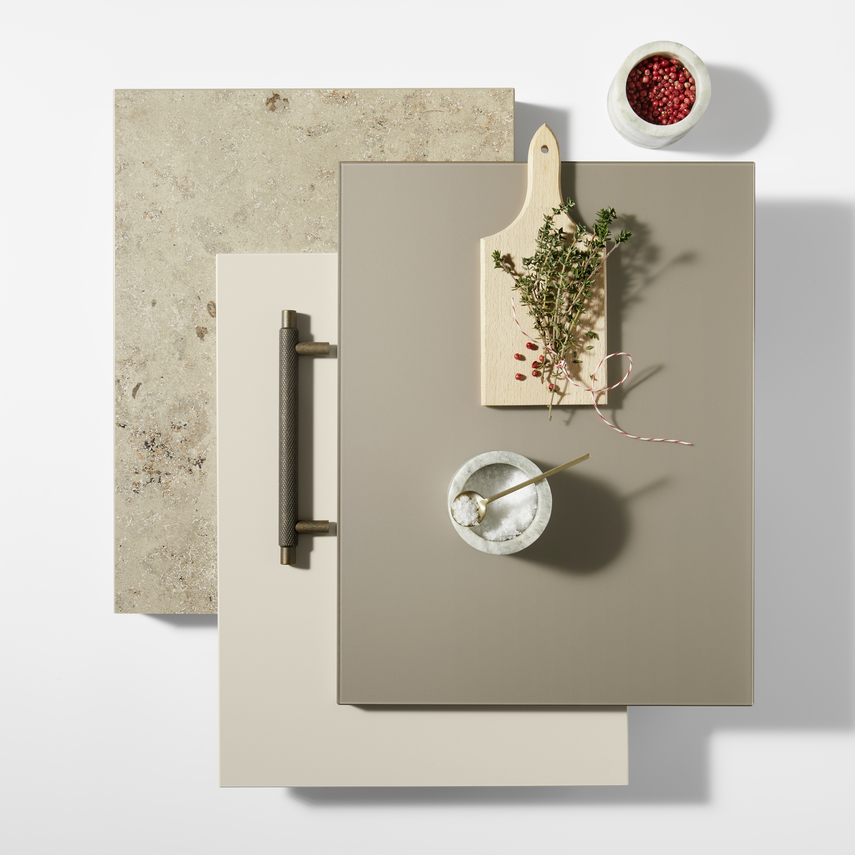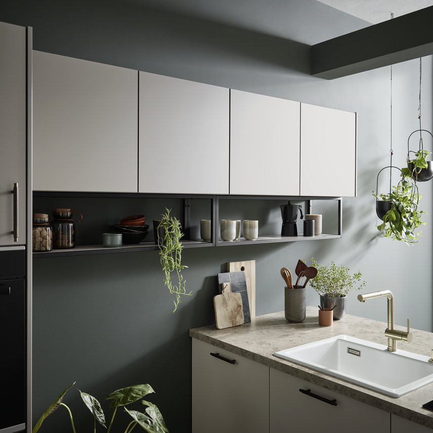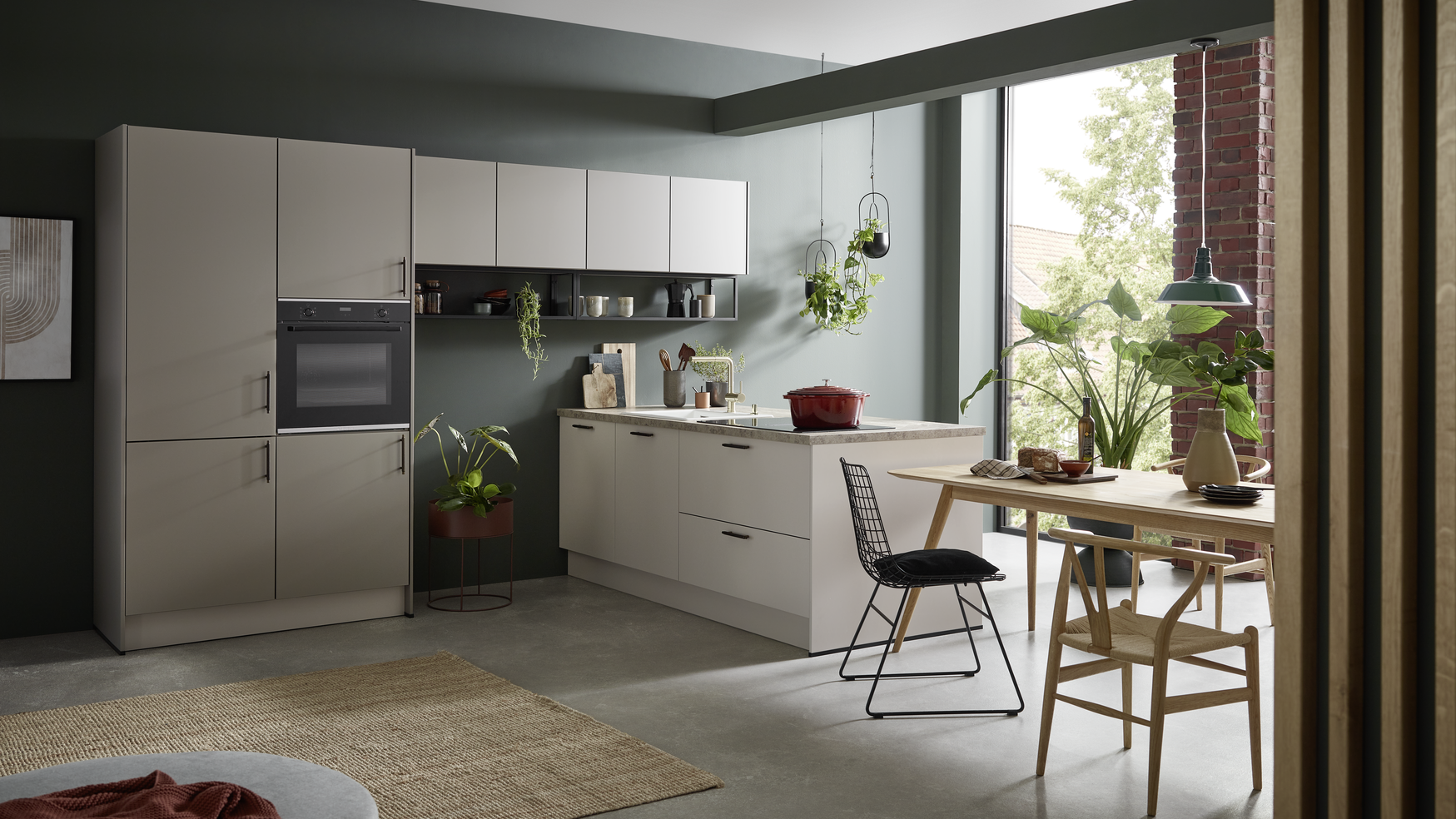 Sandgraue Wohnküche: Praktische Highboard-Höhe und freier Blick – modern und familienfreundlich gestaltet.