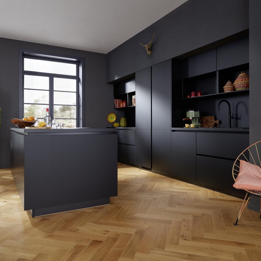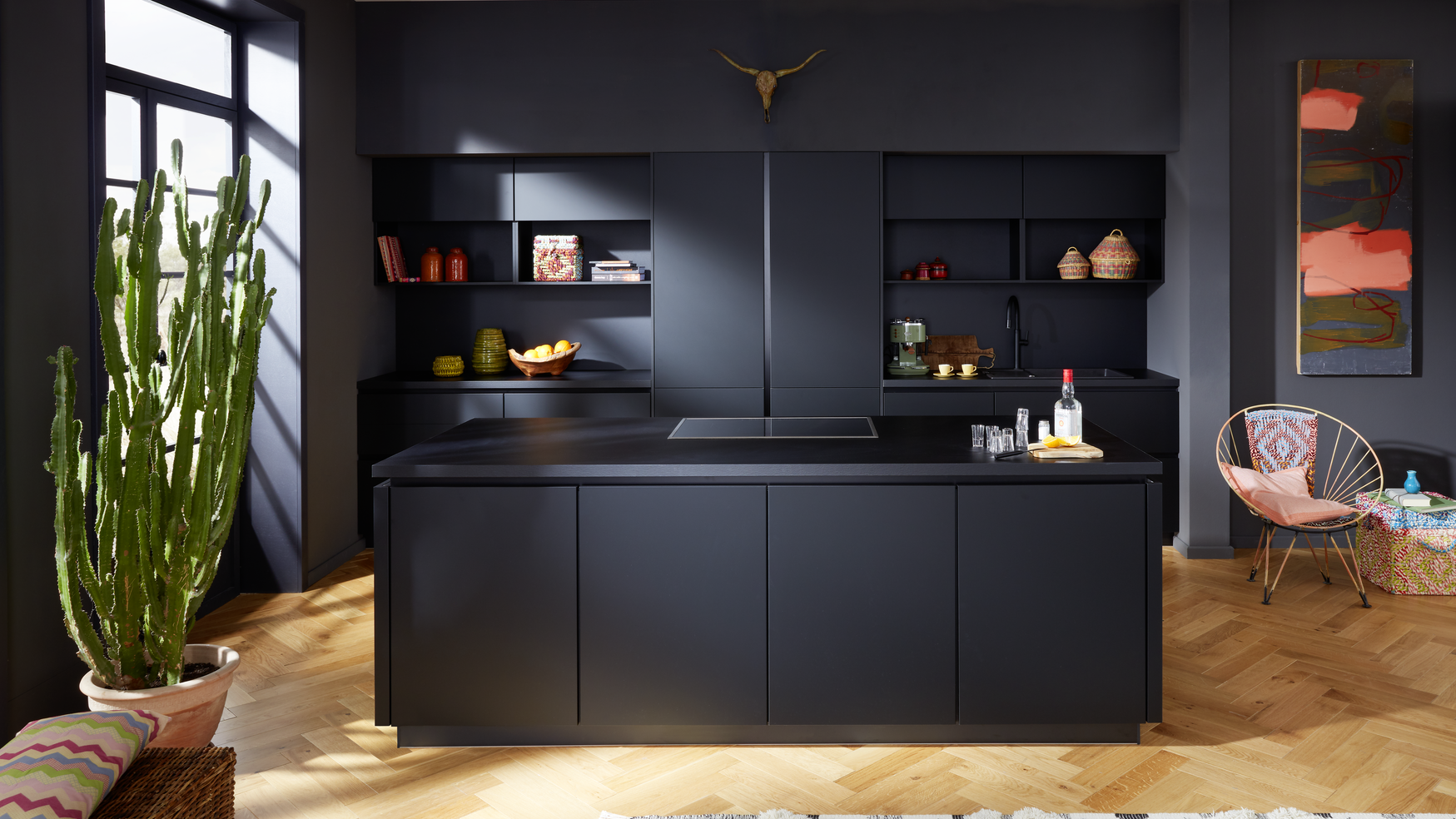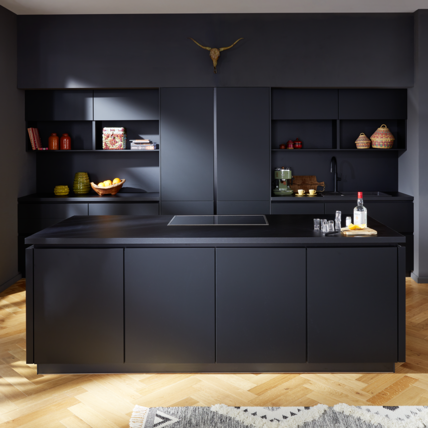 Schwarz und mexikanische Akzente: Eine puristische Küche mit Kochinsel, die südamerikanisches Flair und Eleganz vereint.