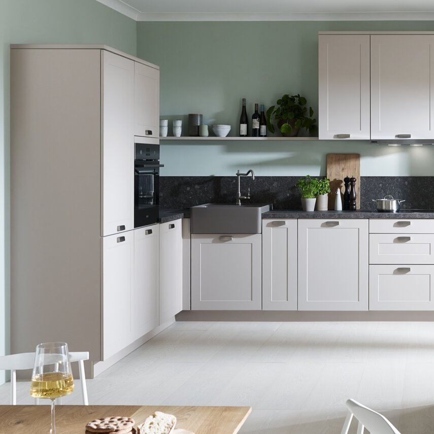Der beste Wein ist doch immer der, den man gemeinsam mit Freunden trinkt! Und wenn das gemütliche Beisammensein darüber hinaus in dieser romantischen Landhausküche stattfindet, wähnt man sich fast an der schönen Mosel. Rahmenfronten in mattem Kaschmir korrespondieren harmonisch mit dem Basaltbraun der Arbeitsplatte. Der markante Spülstein mit nostalgischer Armatur unterstreicht die authentische Atmosphäre dieser Einbauküche, ein offenes Wandregal setzt Geschirr und Weinflaschen gekonnt in Szene.