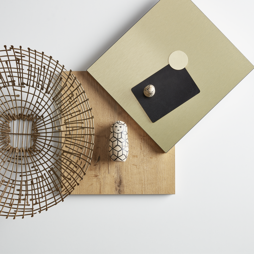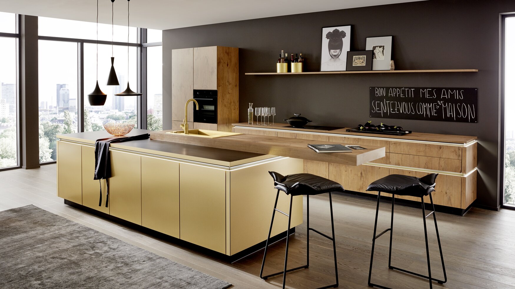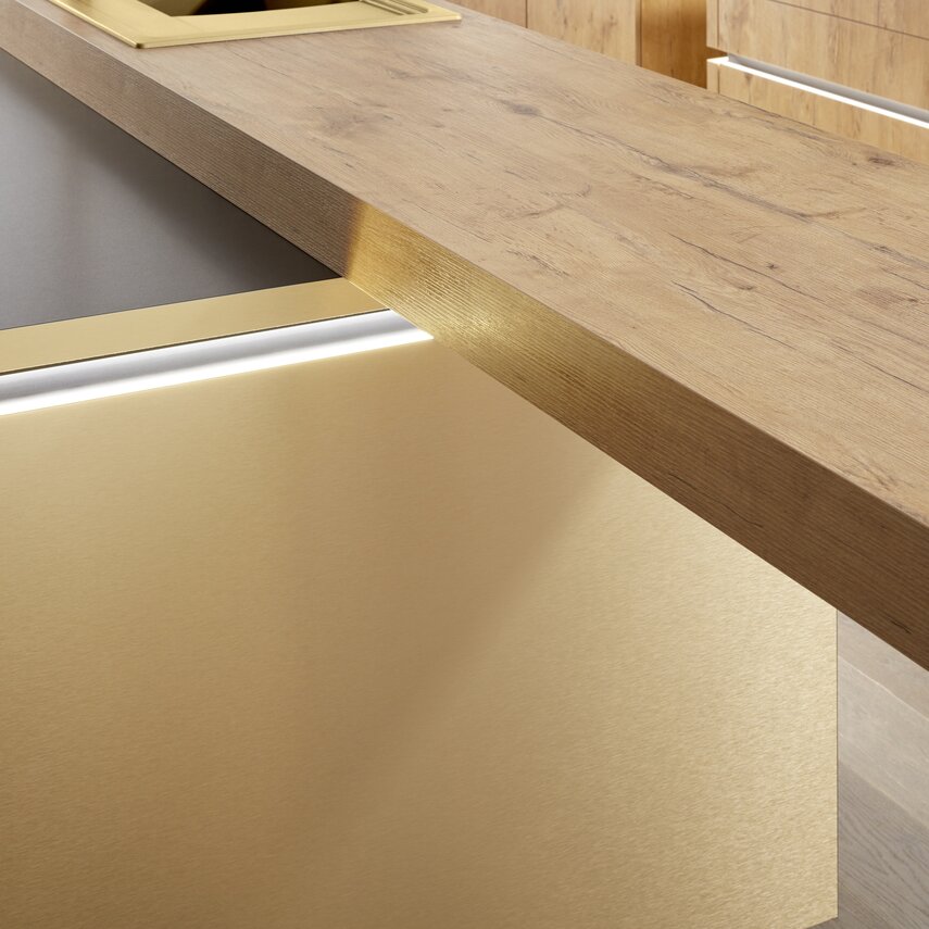 Eine Küche für selbstbewusste Genießer: Goldene Oberflächen stehen in wirkungsvollem Kontrast zu hellem Holz und dunklen Wänden. Die schwebende Arbeitsplatte der Kücheninsel ist wie gemacht für gemeinsame Kochevents in glamouröser Atmosphäre. Grifflose Küchenfronten und beleuchtete Kehlleisten unterstreichen die elegante Wirkung dieses Schmuckstücks. Schönes Extra: Das Induktions-Kochfeld mit dezent integriertem Kochfeldabzug!
