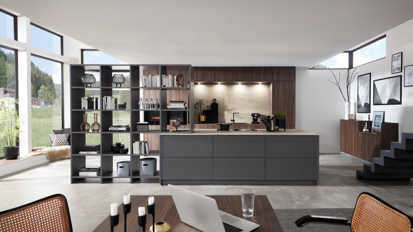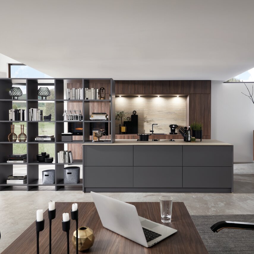 Du magst es großzügig und elegant? Puristisch und gleichzeitig wohnlich? Dann ist diese Küche mit der offenen Kochinsel und dem angrenzenden Wohnregal wie für Dich gemacht. Küche und Wohnraum sind getrennt und doch harmonisch miteinander verbunden. Die grauen Küchenfronten der Insel ergänzen sich perfekt mit den warmen Holztönen. Im Hintergrund setzt die Nischenwand in Steinoptik einen stilvollen Kontrast und rundet das Design auf beeindruckende Weise ab.