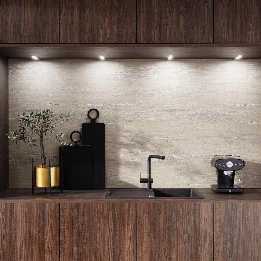 Puristisch und wohnlich: Graue Fronten, warme Holztöne und eine Steinoptik-Nischenwand vereinen Eleganz und Großzügigkeit.