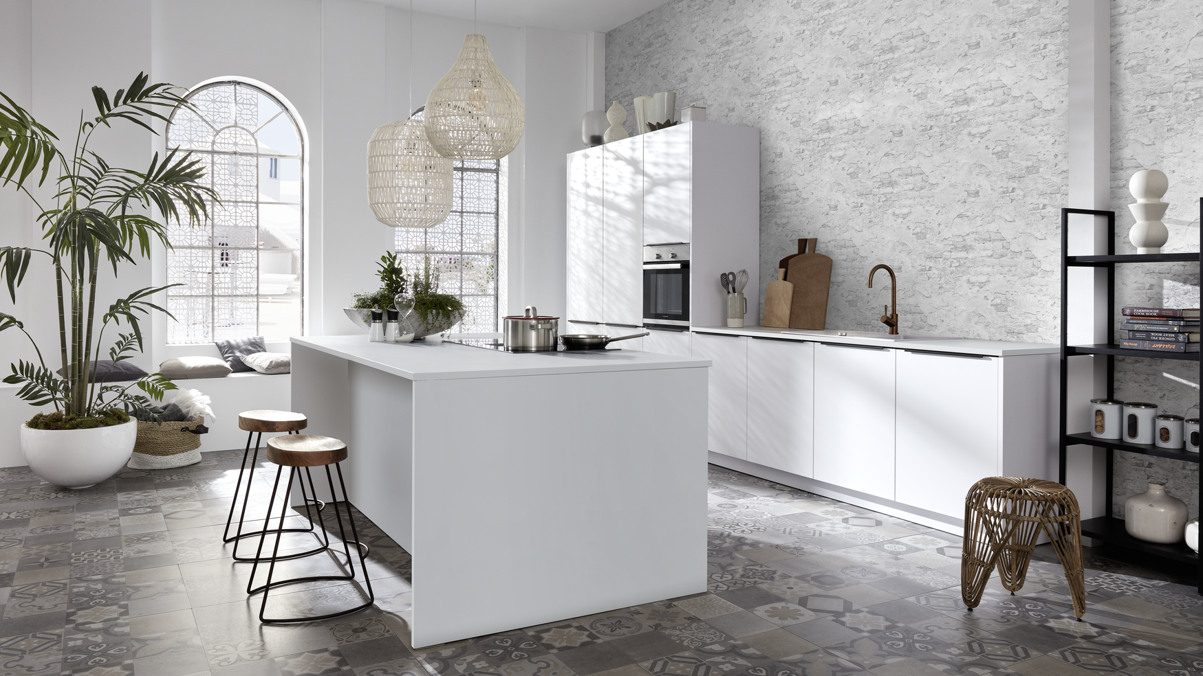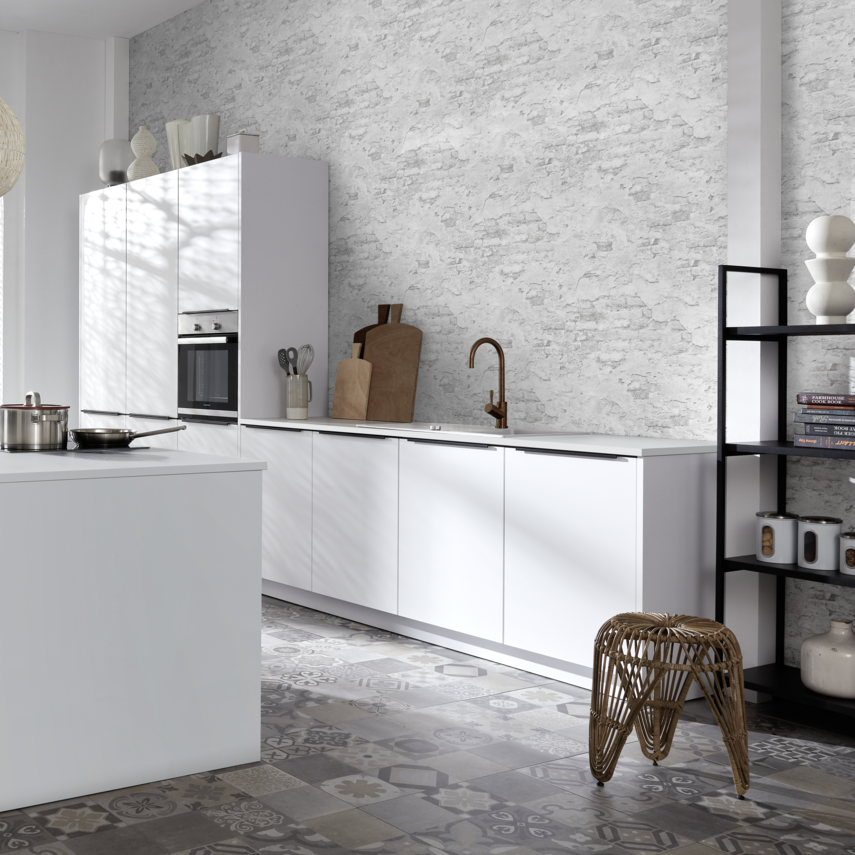 Zwischen Orient und Okzident: Diese Küche vereint Geschichte und Moderne in beeindruckender Harmonie und ist inspiriert von den faszinierenden Kontrasten des orientalischen Chics. Die reinen, weißen Küchenfronten mit schwarzer Griffleiste bieten einen ausdrucksstarken Kontrast zur historischen Umgebung aus Sandstein. Ein besonderes Highlight ist der hohe Korpus, der noch mehr Stauraum in der Küche schafft und damit Funktionalität mit stilvollem Design kombiniert.
