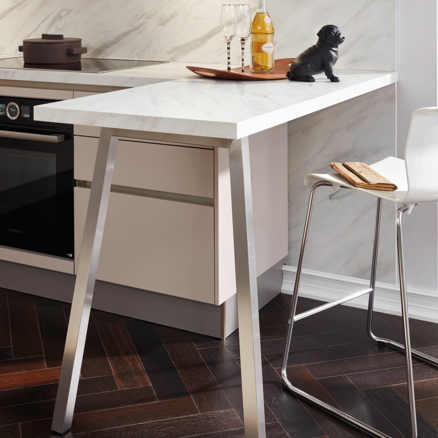 Geradlinig, stylisch und schick. So ist diese Küche perfekt für einen anspruchsvollen Lifestyle. Sie bietet durch die hohen Oberschränke viel Stauraum auf relativ wenig Platz. Die edle Marmoroptik und die schlichten Küchenfronten verleihen ihr einen äußerst eleganten und harmonischen Touch. Der Tresen lädt zum Essen allein oder auf einen Drink zu zweit ein.