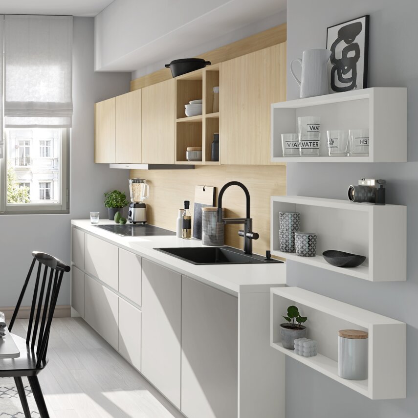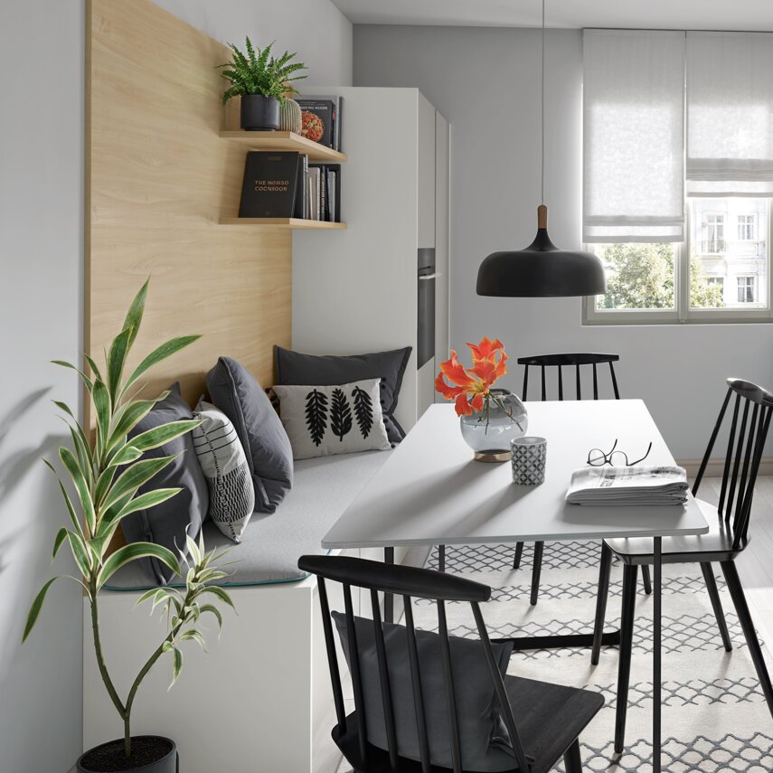Steingrau und Eiche Como: Helles Küchendesign mit Sitzbank, Stauraum und lichtdurchflutetem Charme.