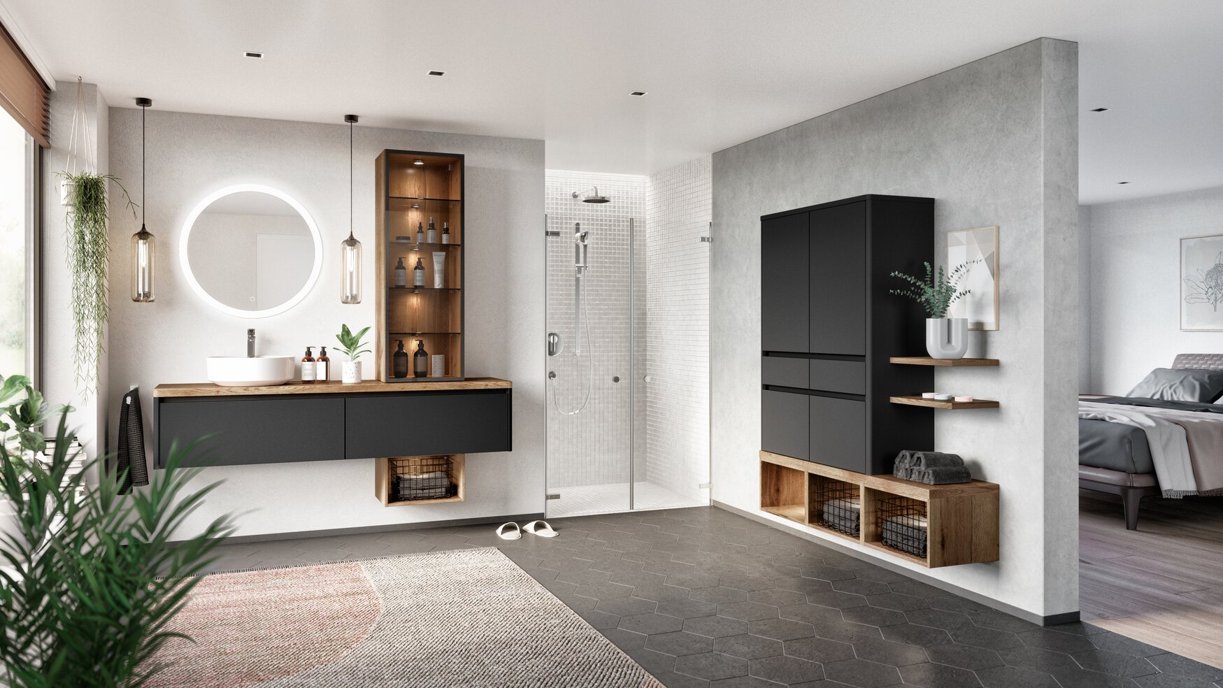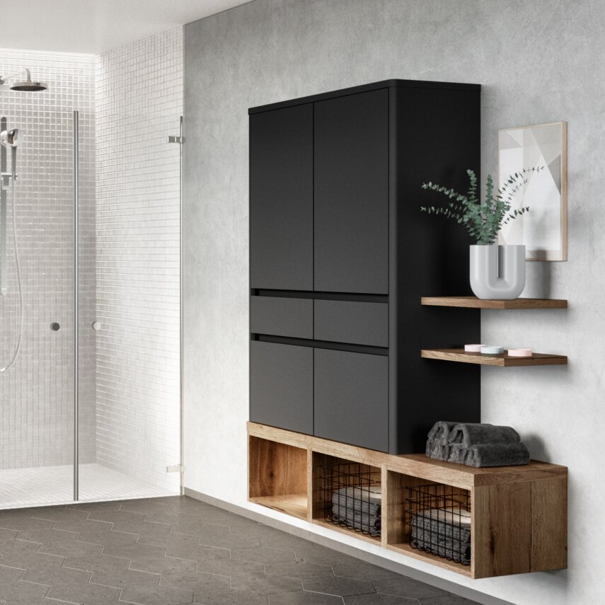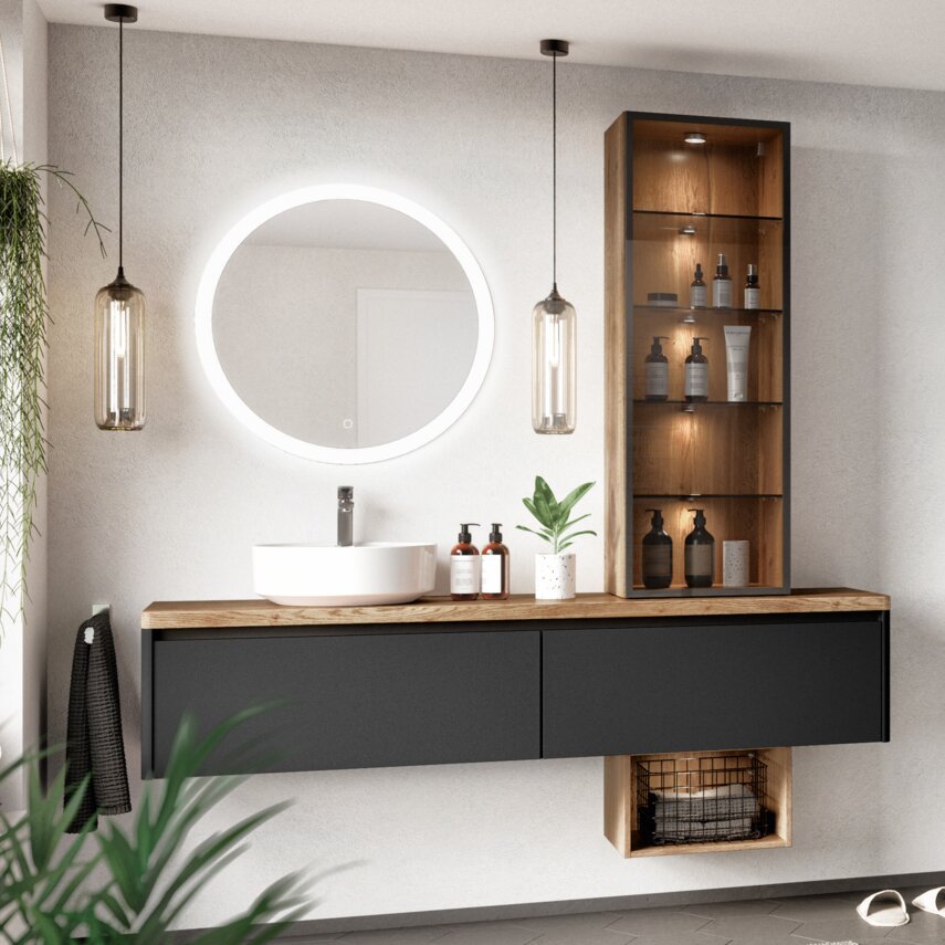Dieses Bad ist ein echtes Design-Spa, das Eleganz und Funktionalität auf höchstem Niveau vereint. Der stilvolle Waschtisch wird durch ein beleuchtetes Regal ergänzt, das nicht nur praktischen Stauraum bietet, sondern auch für eine stimmungsvolle Atmosphäre sorgt. Das schicke Wandschrankelement mit offenen Regalen darunter bietet Platz für Handtücher und setzt gleichzeitig dekorative Akzente. Die Kombination aus tiefem Schwarz und warmen Holztönen schafft einen modernen, luxuriösen Look, der jeden Tag zu einem kleinen Spa-Erlebnis macht. Ein Badezimmer, das durchdacht, ästhetisch und absolut einzigartig ist.