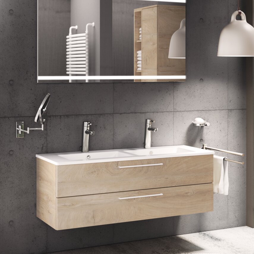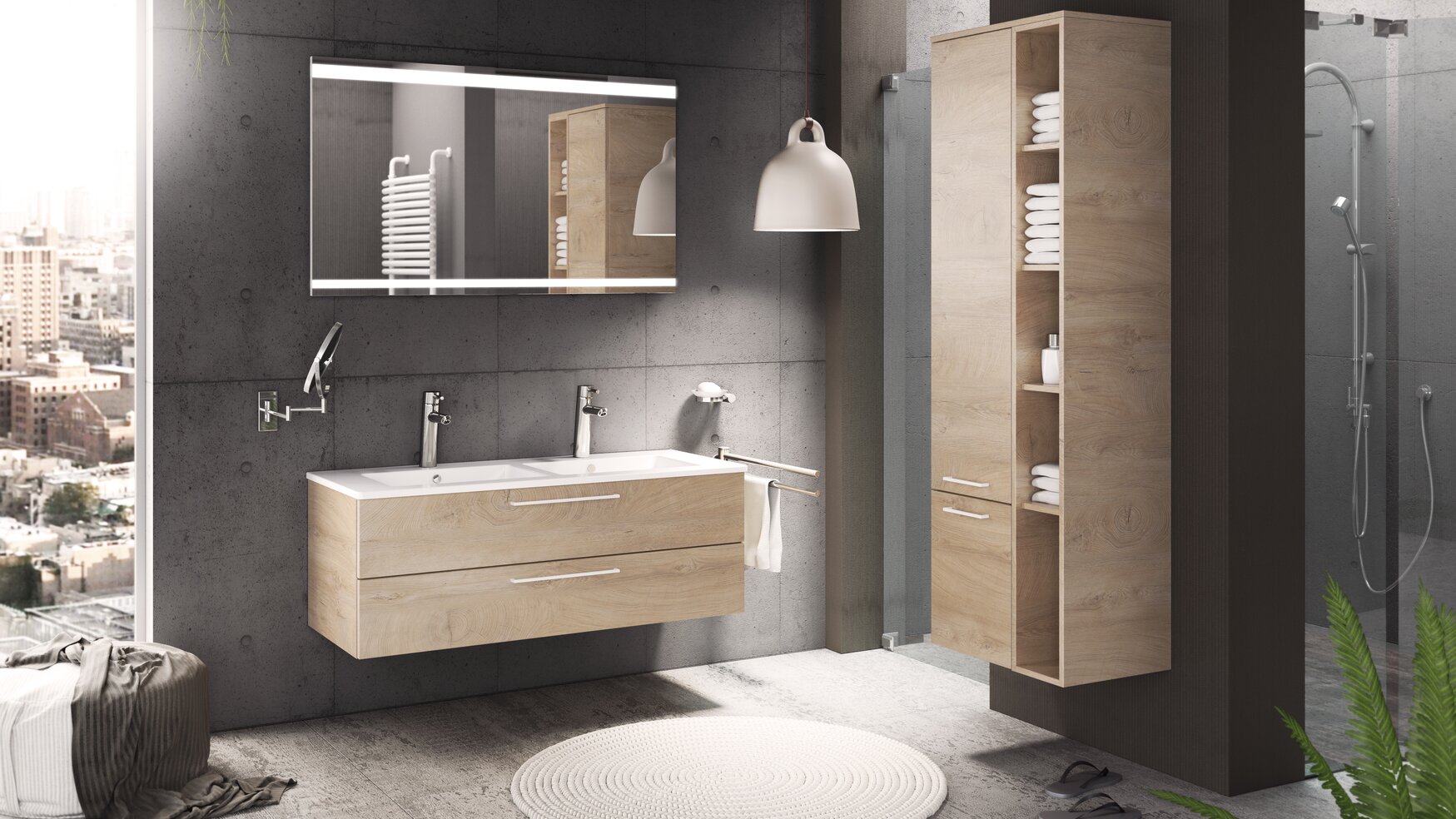 Natürlich und gemütlich: Warmes Holzdekor, großzügiger Waschtisch und viel Stauraum schaffen einen harmonischen Wohlfühlort.