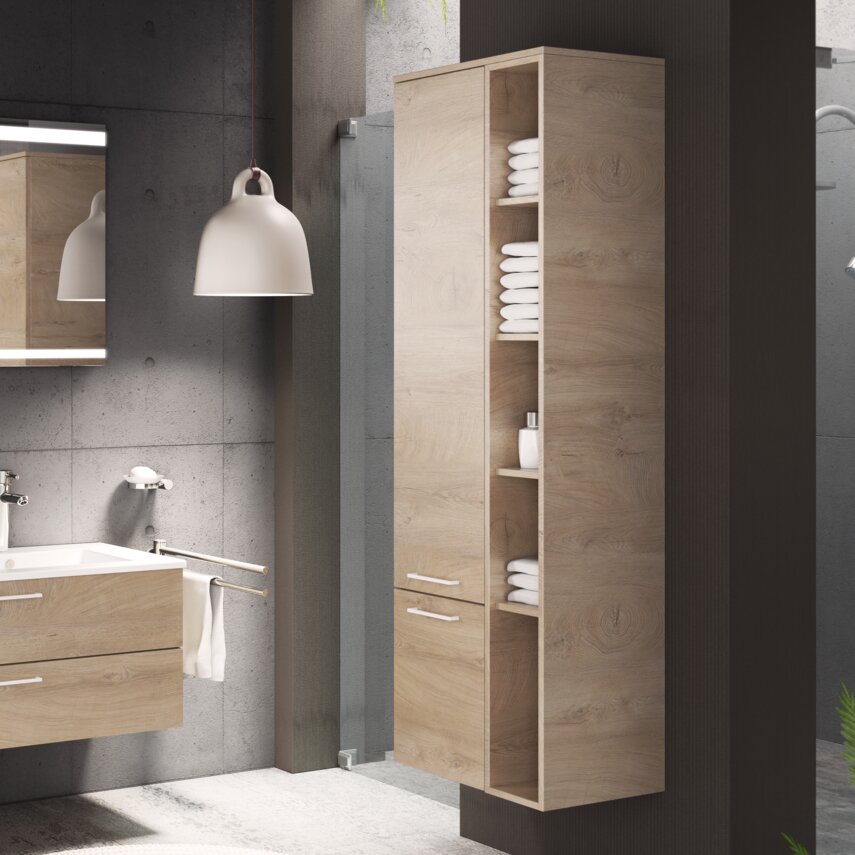 Dieses Bad in warmem Holzdekor ist ein echter Wohlfühlort, der Natürlichkeit und Gemütlichkeit ausstrahlt. Der großzügige Waschtisch bietet nicht nur viel Platz für den täglichen Komfort, sondern wird auch zum stilvollen Mittelpunkt des Raumes. Ergänzt wird das Design durch einen großen Wandschrank, der reichlich Stauraum schafft, sodass alle Badutensilien ihren festen Platz finden. Die harmonische Kombination aus Holzoptik und funktionalen Elementen macht dieses Bad zu einem Ort, an dem man sich jeden Tag gerne aufhält. Ein Raum, der Ruhe und Ordnung gleichermaßen bietet!