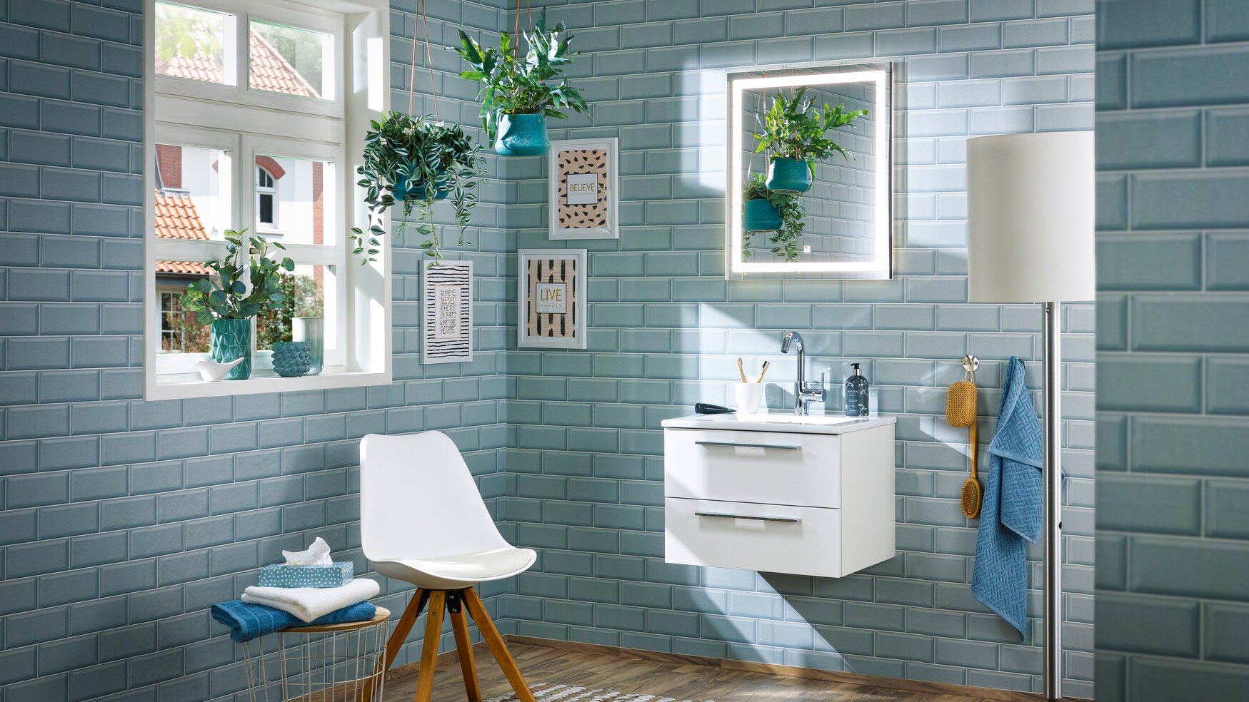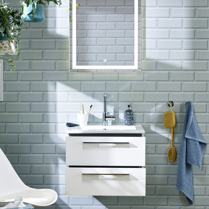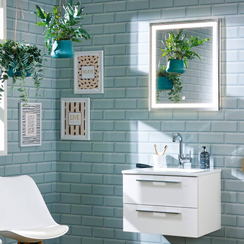 Klar und erfrischend: Ein weißer Waschtisch und ein beleuchteter Spiegel bringen Eleganz und Leichtigkeit in dieses moderne Bad.