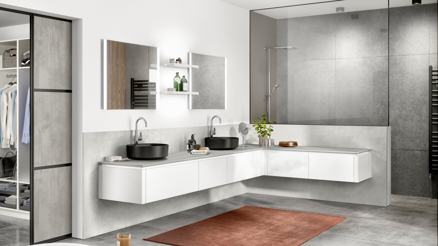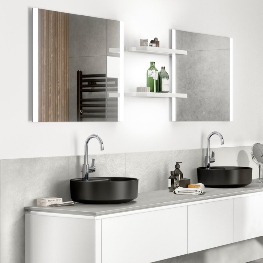 Schwarz-Weiß-Eleganz: Runde schwarze Waschbecken, beleuchtete Spiegel und klare Strukturen schaffen ein modernes, minimalistisches Bad.