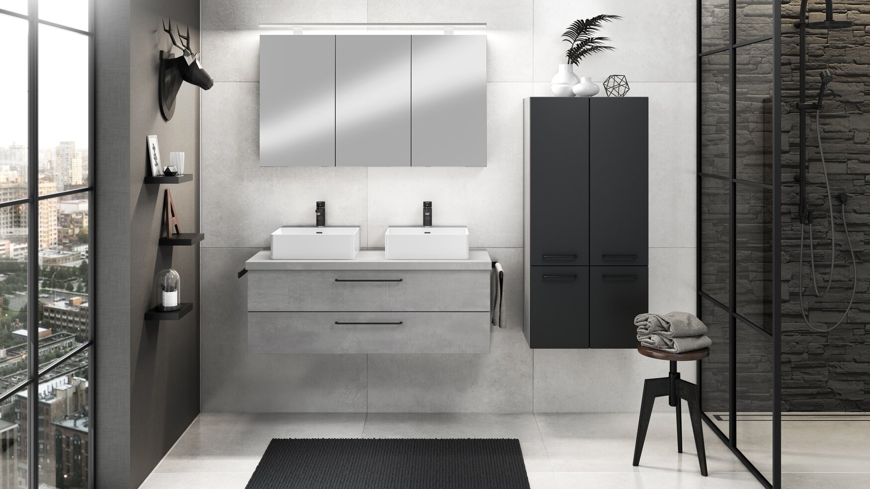 Urban und modern: Betonoptik trifft Carbon für ein stylishes Bad mit Industrial-Charme und klarer Ästhetik.
