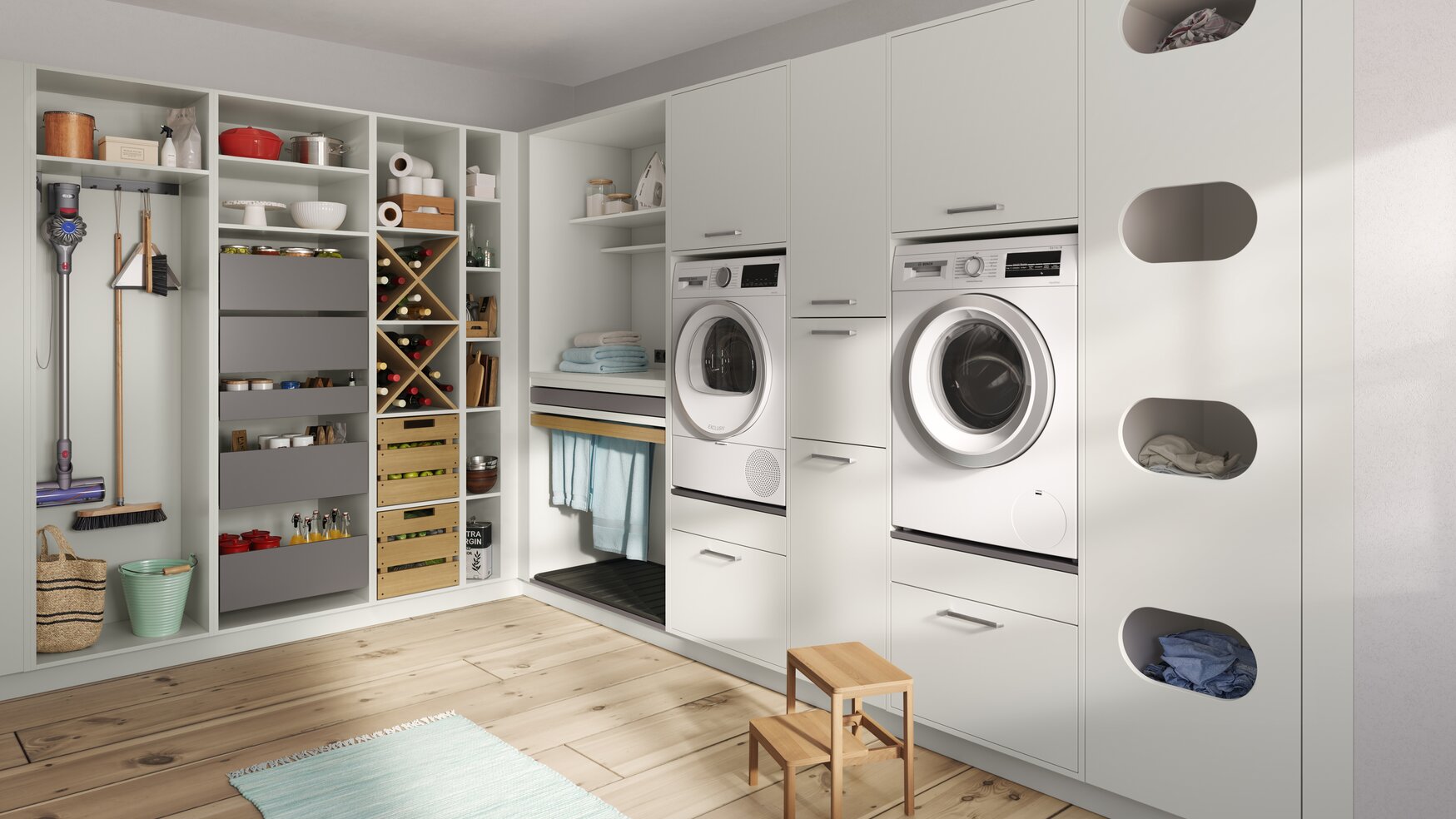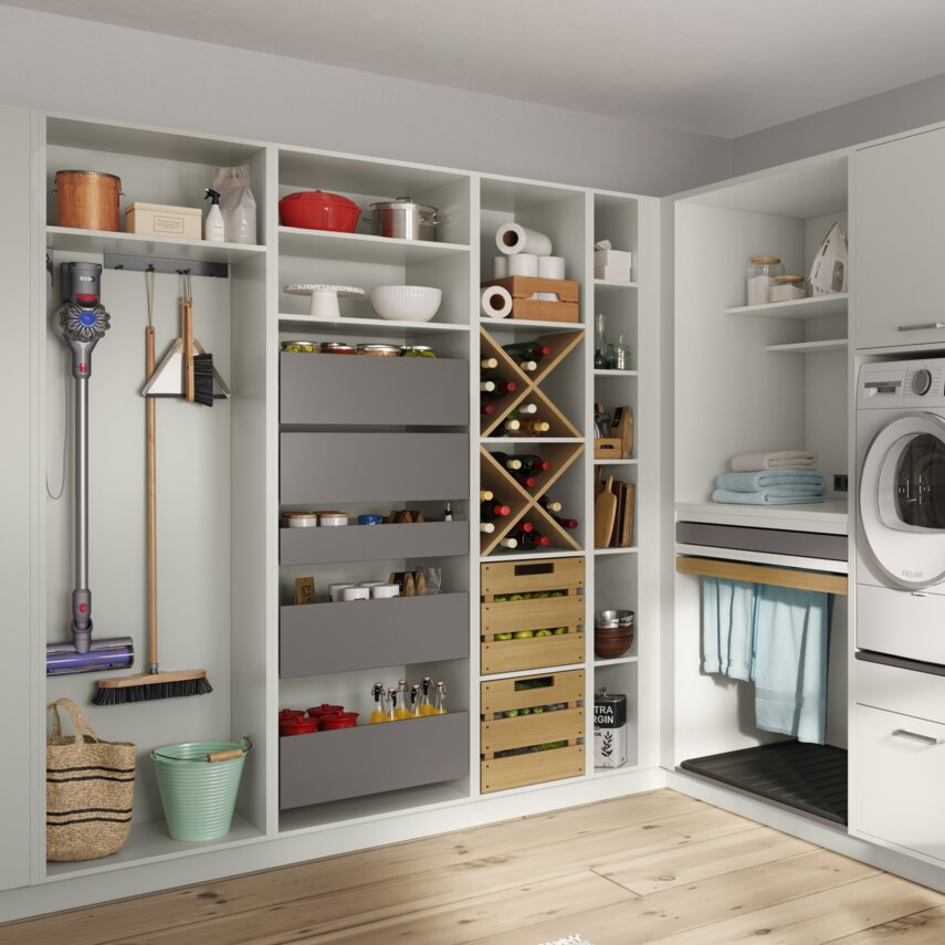 Hauswirtschaftsraum und Speisekammer in einem: Clever organisiert für komfortable Wäschepflege und Vorratshaltung.