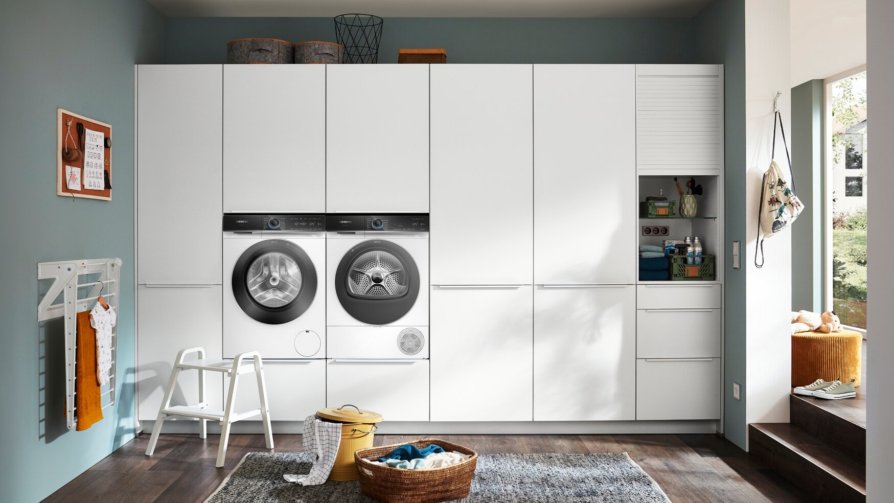 Kompakt und elegant: Stilvolle Fronten verbergen Stauraum für Besen, Staubsauger und eine Sortierstation für Wäsche.