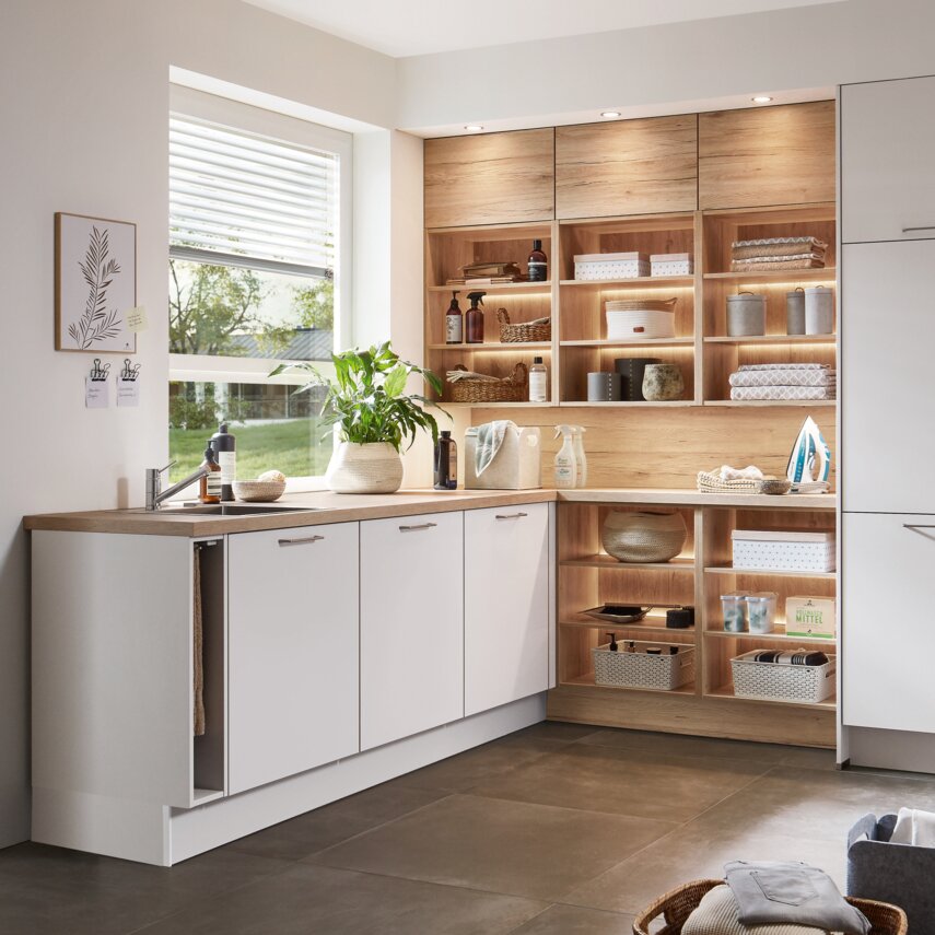 Kompakt, gut durchdacht und immer alles in Reichweite – dieser Hauswirtschaftsraum punktet mit cleveren Lösungen. Ob das Hochschrankregal für Getränkekisten, der praktische Besen-Hochschrank oder die Schubladen mit integrierten Wäschekorbauszügen – hinter den Türen versteckt sich eine perfekte Ordnung. Die offenen Regale setzen nicht nur optische Akzente, sondern schaffen auch zusätzlichen Stauraum und machen den Raum zu einem funktionalen Highlight.