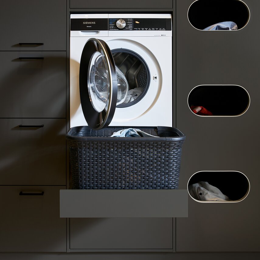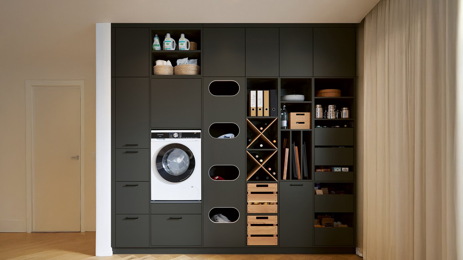 Kompakte HWR-Lösung in Lavaschwarz – platzsparend, funktional und mit cleverem Stauraum für Wäsche, Bleche und Bretter.