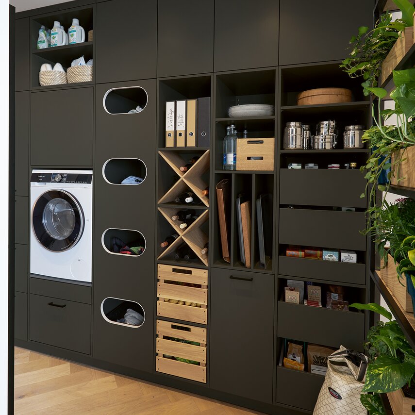 Diese kleine, aber äußerst praktische HWR-Lösung beweist, wie clever man selbst wenig Raum nutzen kann. Mit einer deckenhohen Planung bietet sie erstaunlich viel Stauraum und vereint zahlreiche Funktionen auf kleinstem Platz. Die moderne Optik in elegantem Lavaschwarz verleiht dem Raum eine stilvolle Note. Besonders praktisch sind der integrierte Wäschesortierschrank sowie die großen Fächer, in denen Backbleche und Holzbretter übersichtlich verstaut werden können. So entsteht ein Hauswirtschaftsraum, der trotz kompakter Maße maximalen Komfort und Ordnung bietet.