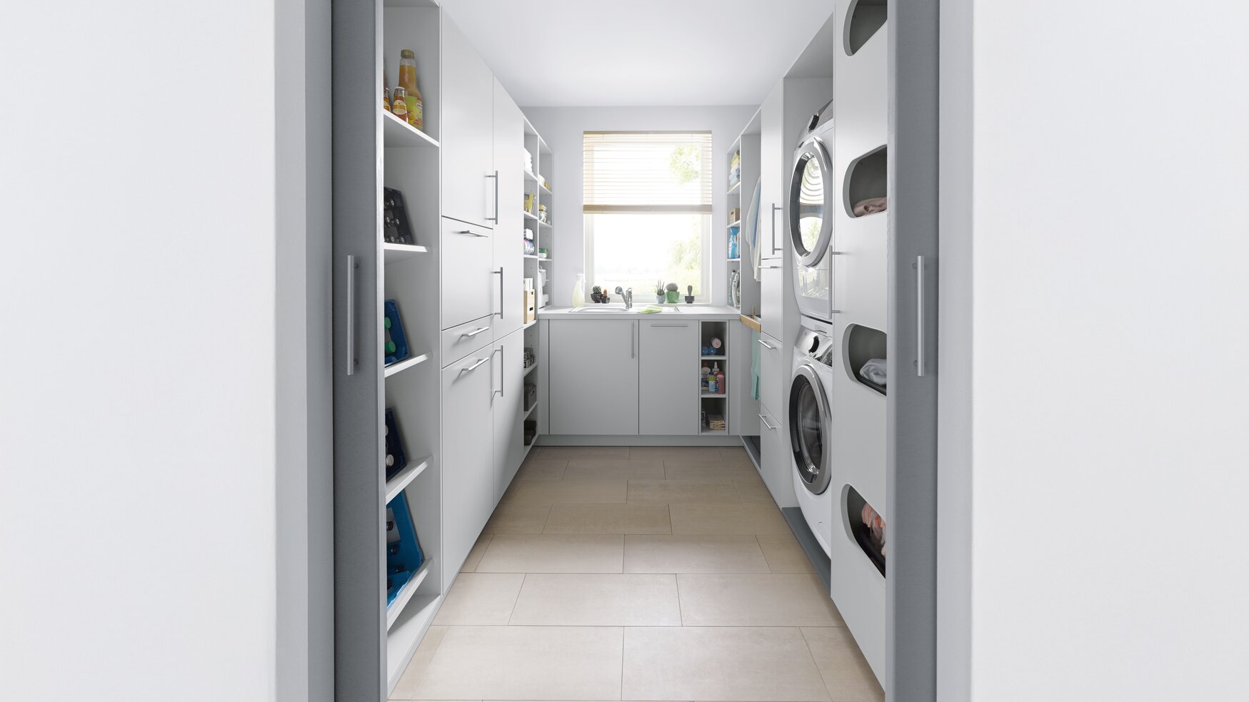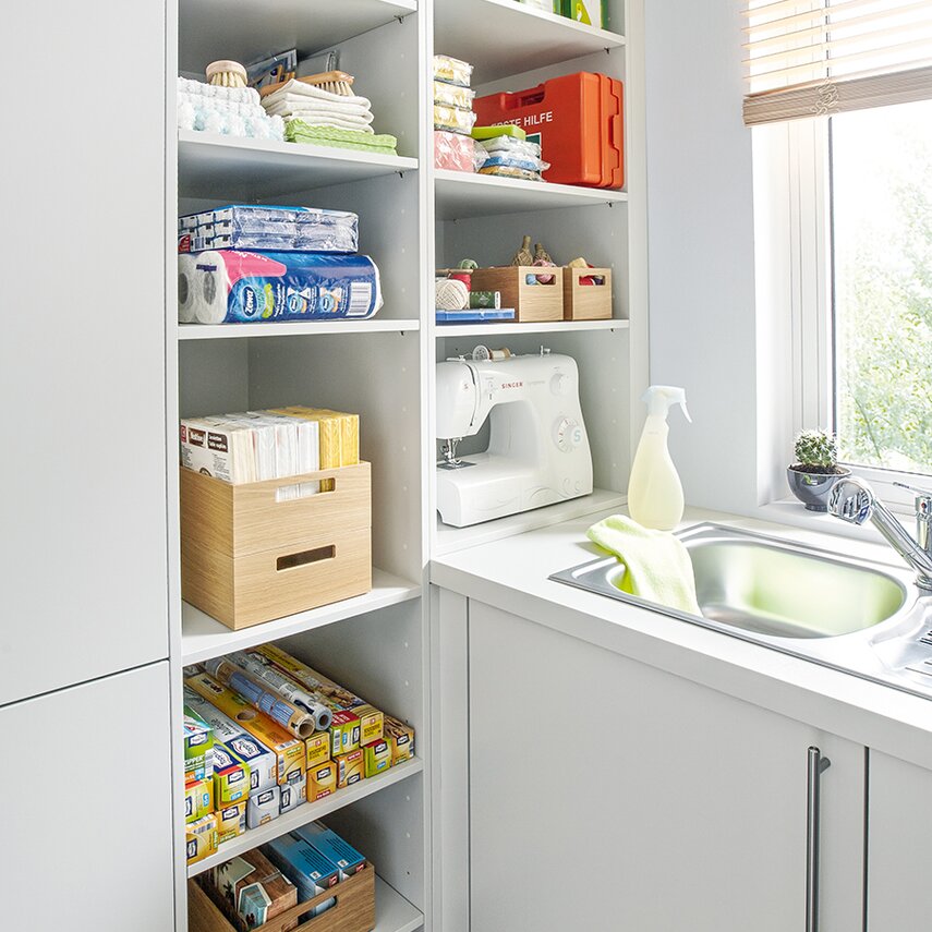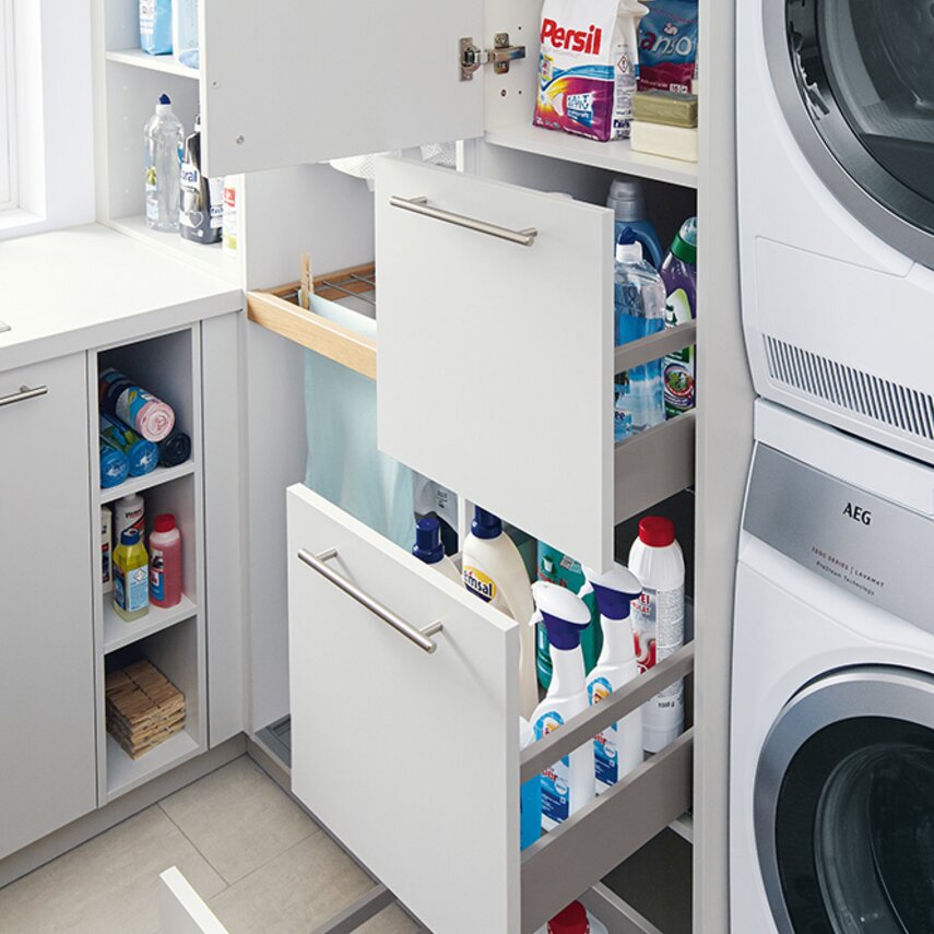 Multitalent in Weiß: Clevere Schränke sorgen für Ordnung und Zugänglichkeit bei Wäsche, Vorräten und Reinigungsutensilien.