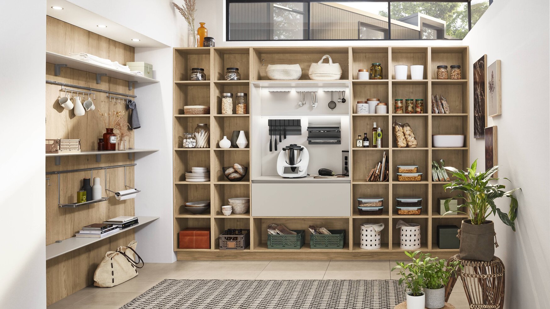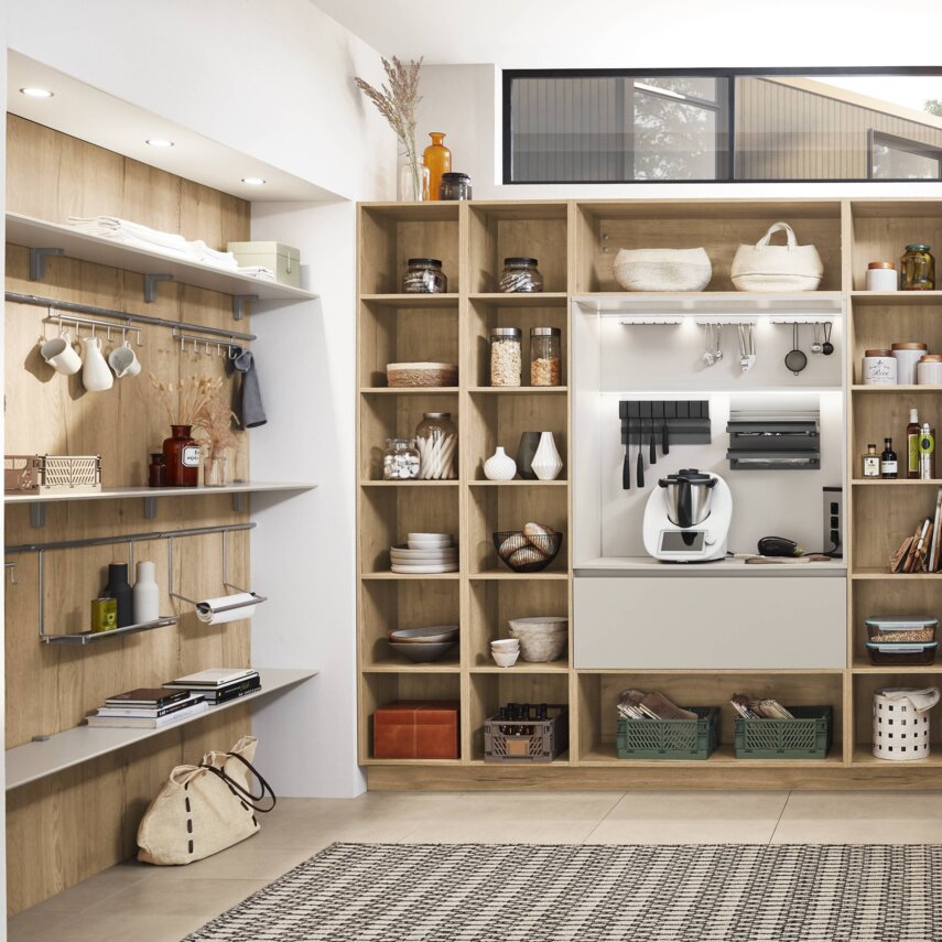 Speisekammer in warmen, wohnlichen Tönen – clever organisiert mit reichlich Platz und Regalen.