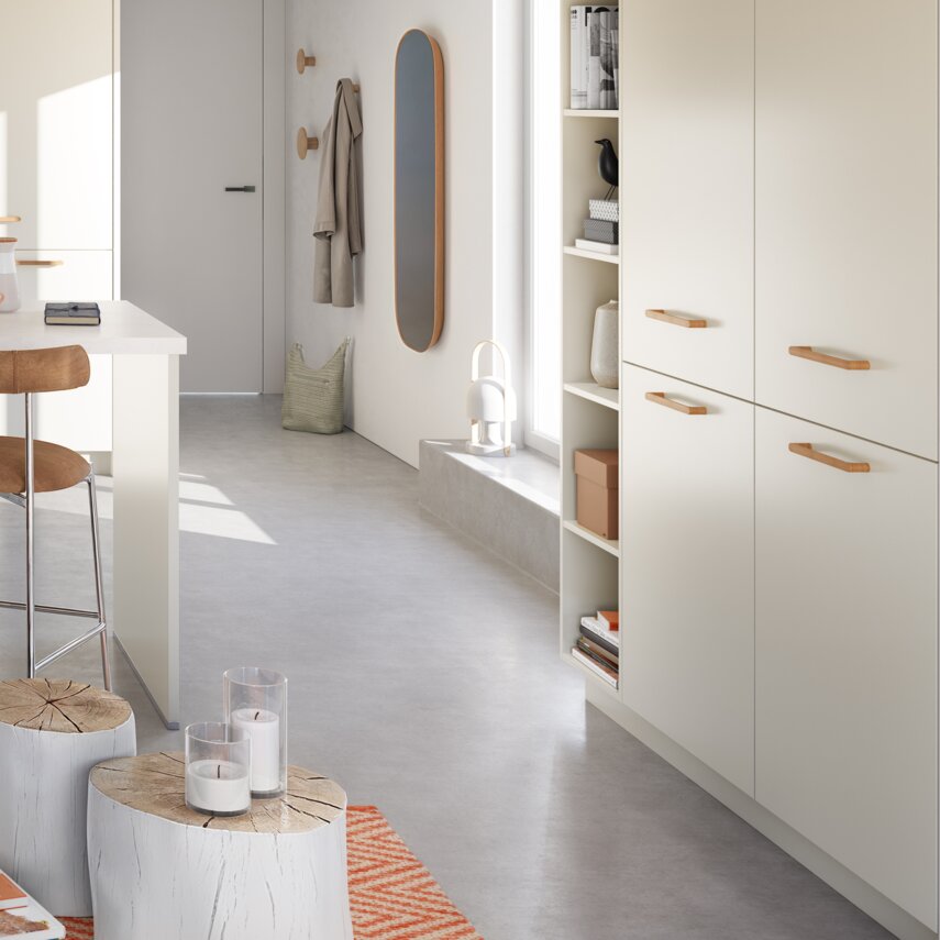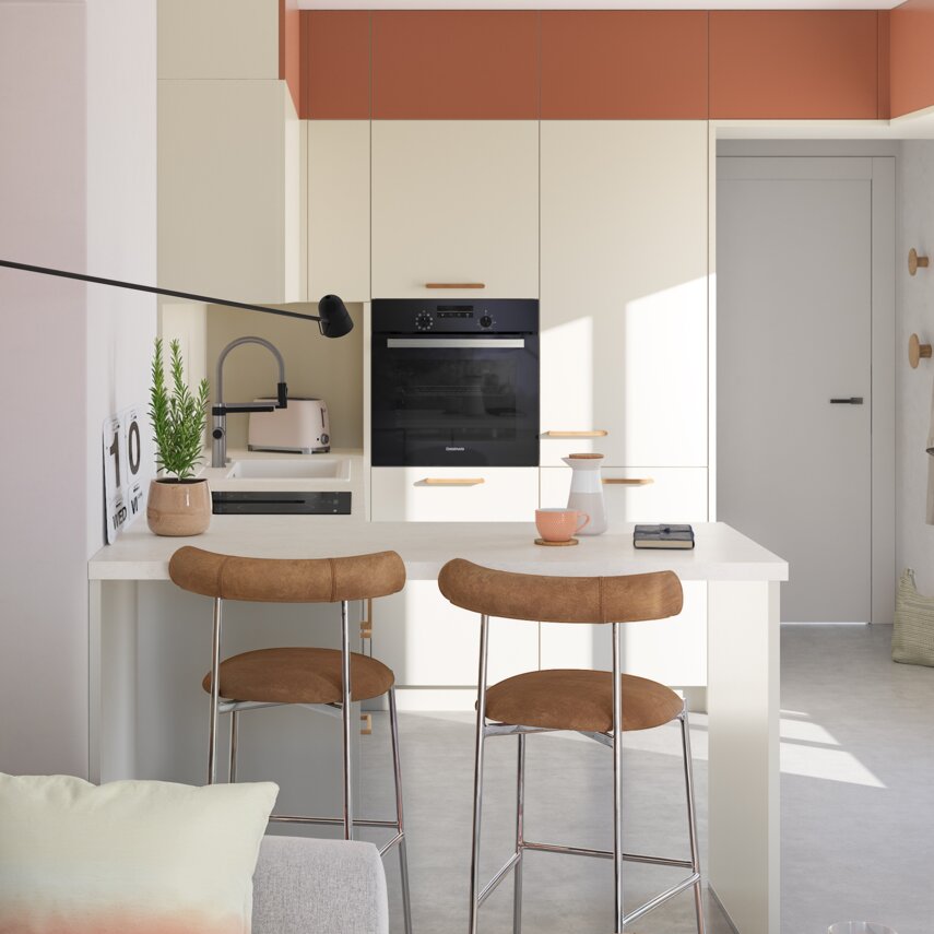 Orientrot und Muschelweiß: Eine clevere Küche mit Holzakzenten, die Stauraum und Wohnlichkeit vereint.
