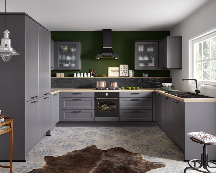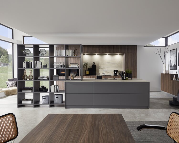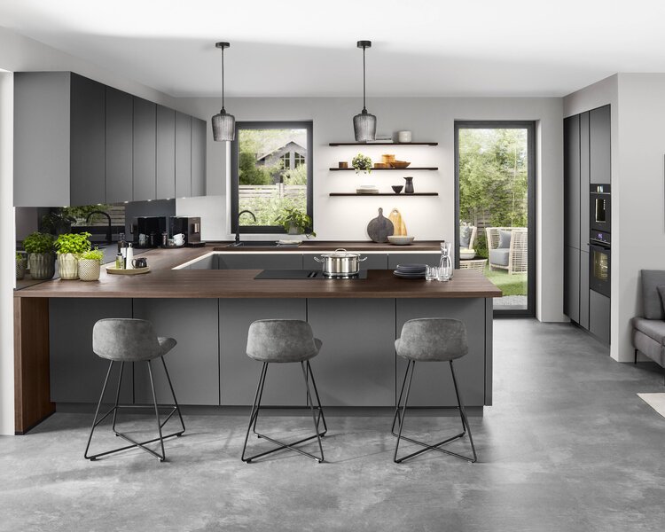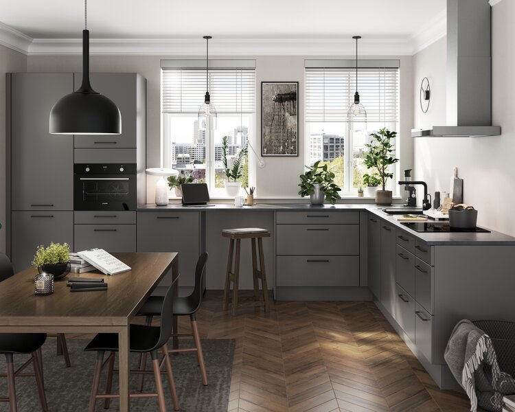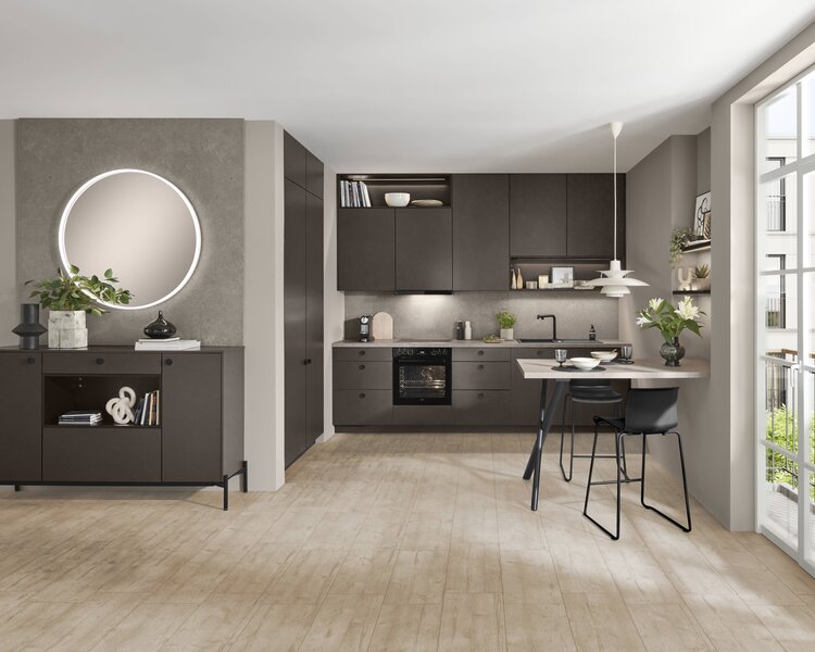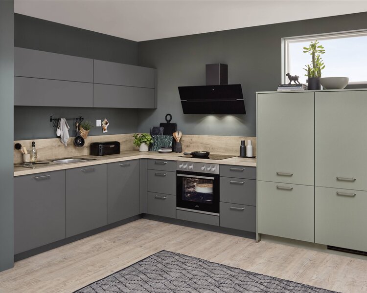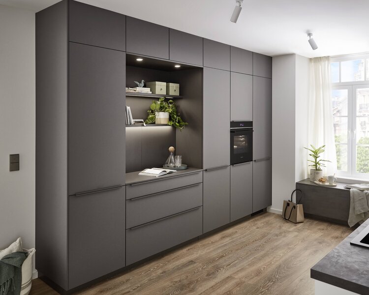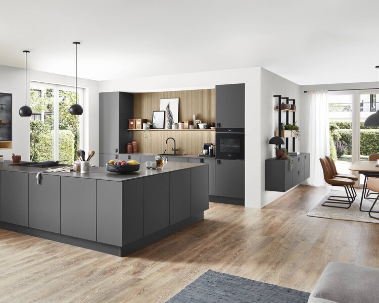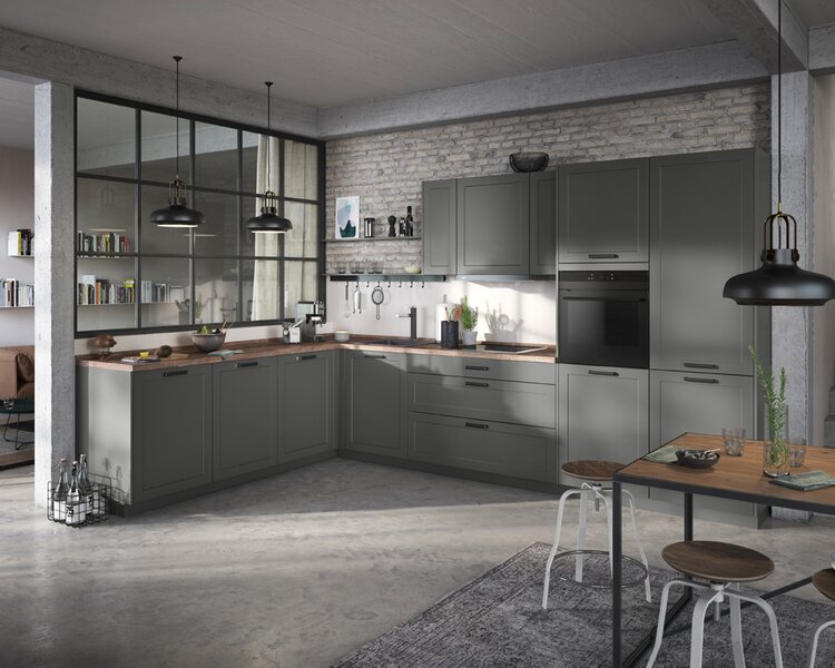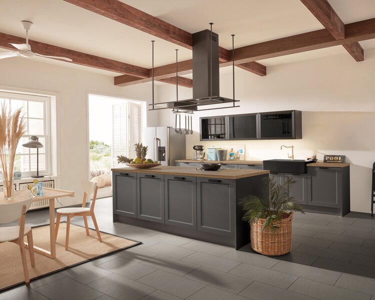 Anthrazit steht für Stil, Struktur und Stabilität – eine Farbe, die sich nicht in den Vordergrund drängt, aber Präsenz zeigt. Sie schafft eine perfekte Bühne für Materialien wie Holz, Stein oder Metall und ist damit eine ideale Grundlage für moderne Küchendesigns.
