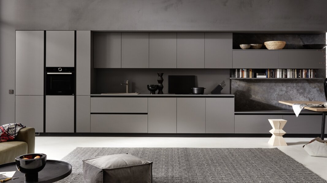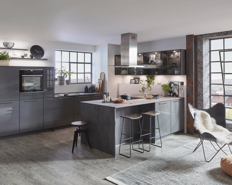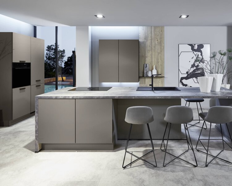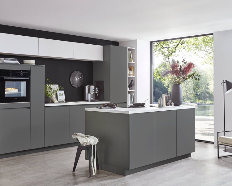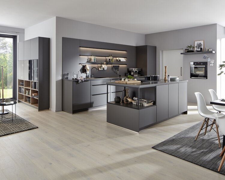 Anthrazit ist eine der edelsten Nuancen innerhalb der Graupalette – dunkler, intensiver und charakterstark. Der hohe Schwarzanteil verleiht Anthrazit eine besondere Tiefe und sorgt für eine elegante, luxuriöse Ausstrahlung. Küchen in Anthrazit wirken modern, hochwertig und zugleich ruhig. Je nach Oberflächenbeschaffenheit – ob matt, samtig oder hochglänzend – entsteht ein völlig unterschiedlicher Charakter: Mattflächen wirken puristisch und zurückhaltend, während glänzende Fronten das Licht reflektieren und die Küche lebendiger erscheinen lassen.