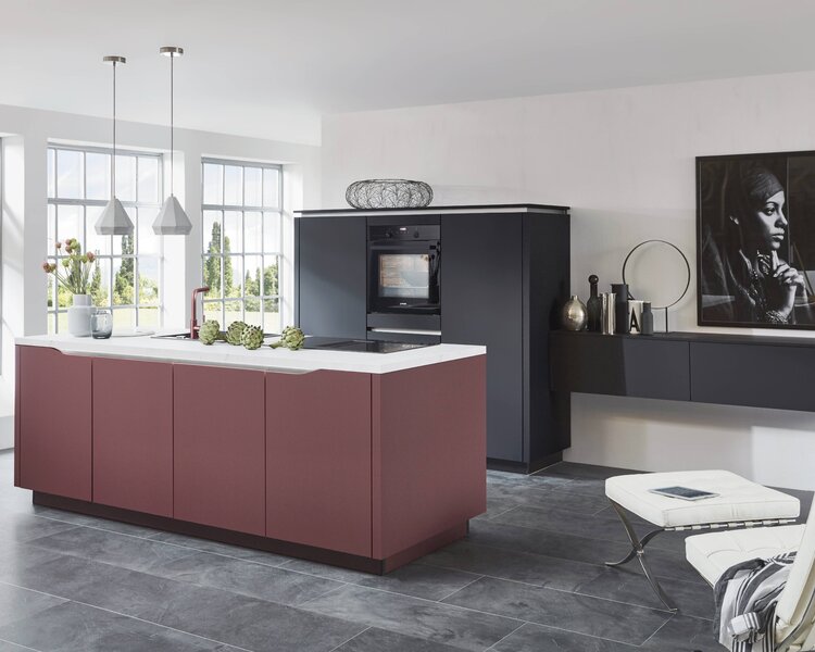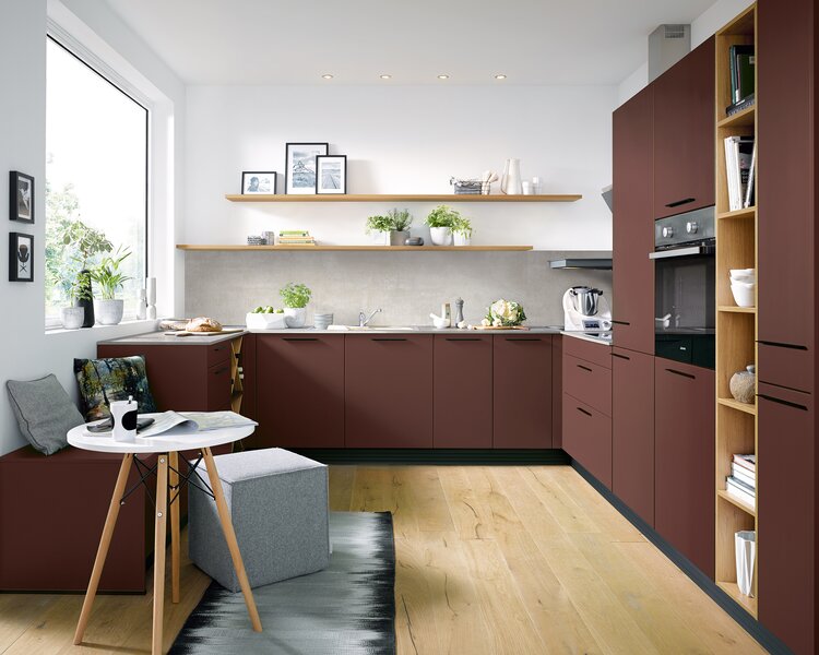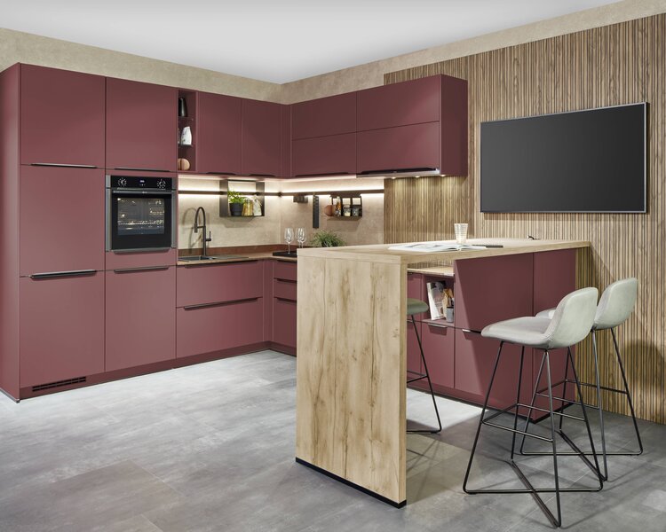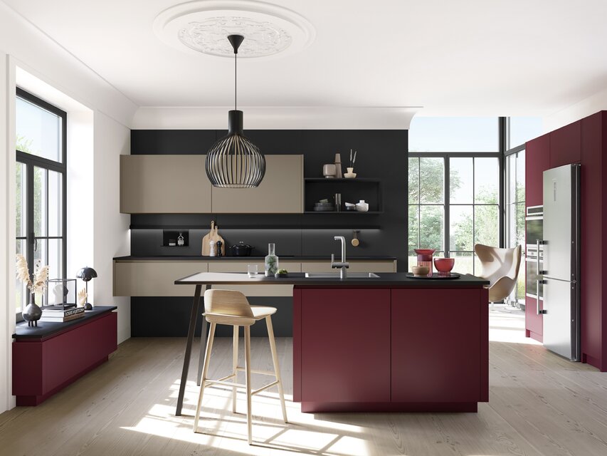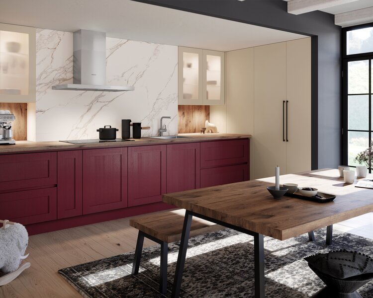 Weinrot ist eine vielseitige und elegante Farbe, die in der Küche eine besondere Ausstrahlung hat. Sie strahlt Wärme und Gemütlichkeit aus und kann in verschiedenen Räumen eine einladende Atmosphäre schaffen. Eine der besten Kombinationen ist mit hellen Cremetönen. Diese sanften Nuancen schaffen einen wunderbaren Kontrast zu dem tiefen Weinrot und sorgen für eine warme, einladende Atmosphäre. Diese Kombination eignet sich besonders gut für Wände, Möbel oder Textilien, um die Küche aufzulockern und ihm eine freundliche Note zu verleihen. Helle Cremetöne bringen Licht und Frische in den Raum, während Weinrot für Tiefe und Charakter sorgt.