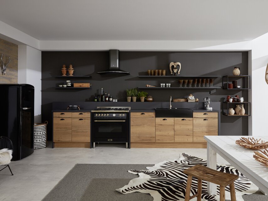 Rustikale Holzbretter an der Wand bieten einen schönen Platz für tolle Dekorationen. Wie wäre es mit einem Fernglas als exotische Dekoration, einem Safarihut oder einem hübschen Souvenir aus dem letzten Urlaub? Diese Elemente erzählen Geschichten und machen Deine Küche zu einem Ort der Entdeckung. Die Holzbretter können auch als zusätzlicher Stauraum genutzt werden: Körbe aus Bast oder Rattan eignen sich prima, um kleine Dinge zu verstauen und sehen gleichzeitig trendig aus. Diese Körbe bringen nicht nur Ordnung in Deine Küche, sondern verstärken auch den natürlichen Look.