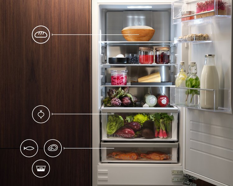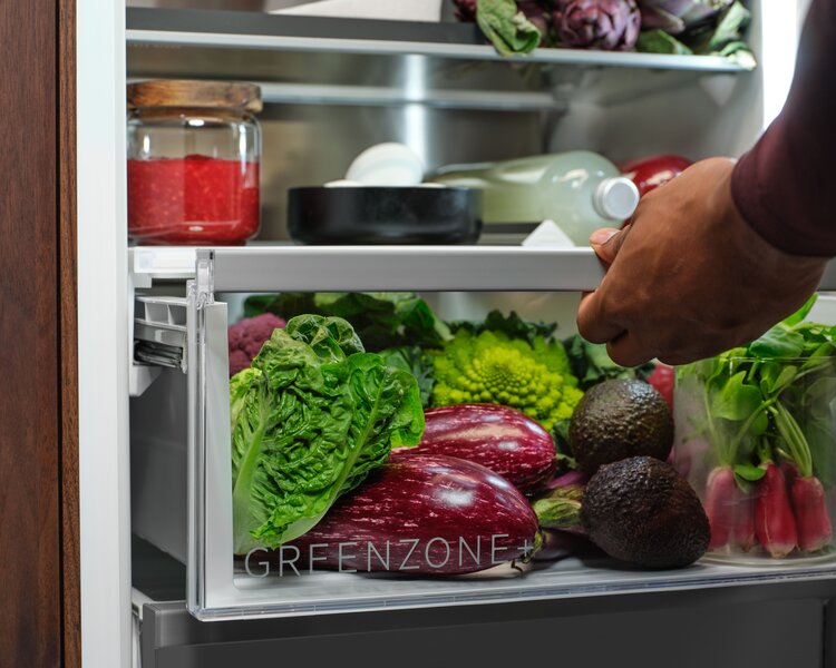 Nicht überladen: Damit die Temperaturen in den einzelnen Kühlzonen stabil bleiben, achte darauf, den Kühlschrank nicht zu überladen. Nur wenn die Luft zirkulieren kann, lässt sich eine lange Lagerung gewährleisten. Entscheide Dich daher beim Kauf für eine passende Kühlschrankgröße. Ein kleines Kühlgerät mit 150 Litern Fassungsvermögen und etwa 88 cm Höhe ist für ein bis zwei Personen ausreichend. Familien oder Haushalte, die vieles auf Vorrat kaufen, wählen hingegen ein größeres Gerät mit einer Höhe von etwa 145 cm und 215 Liter Fassungsvermögen.