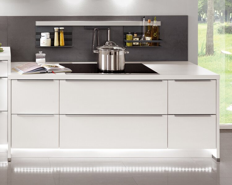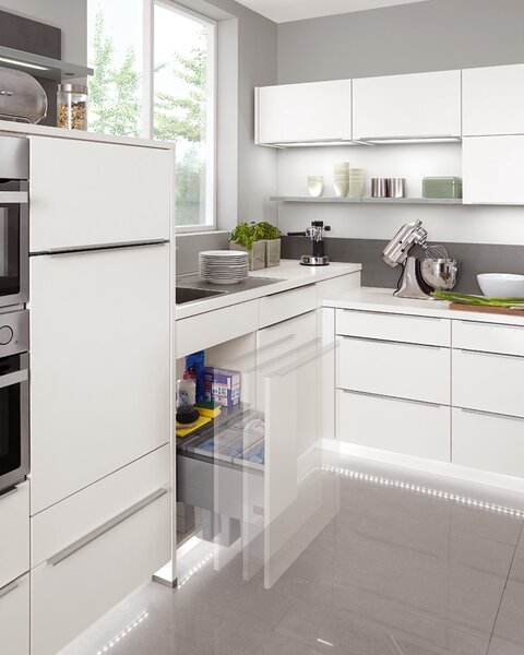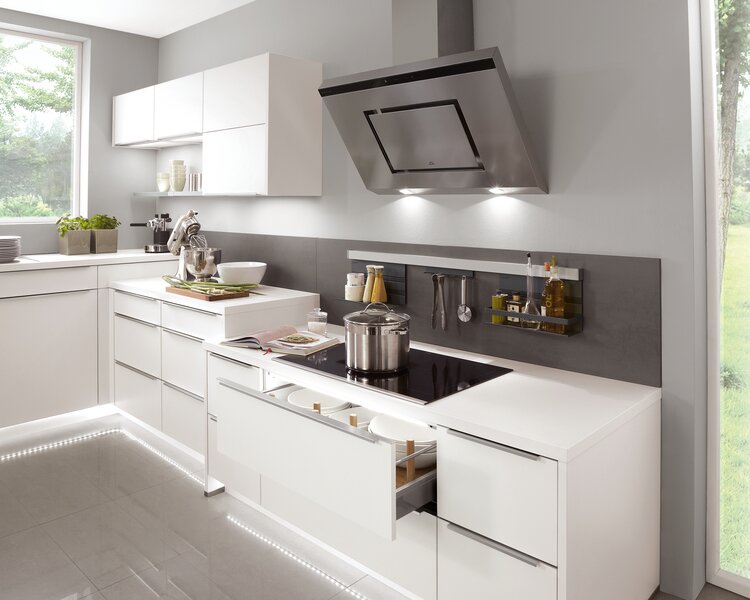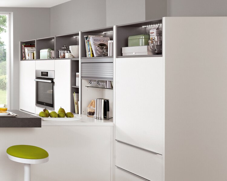 Plane Vollauszüge statt Unterschränke mit Türen, damit Du viel leichter an Dein Geschirr gelangst. Auszüge und Schranktüren sollten mit einer Anschlagdämpfung ausgestattet sein, und elektrische Öffnungsunterstützungen sind ebenfalls von Vorteil.