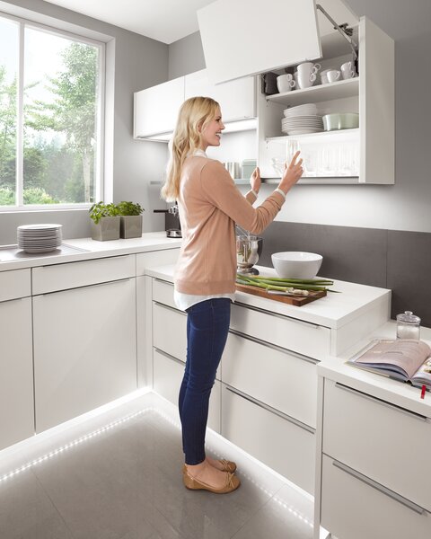 Erwäge, Lift- oder Klappenoberschränke zu wählen, anstatt Oberschränke mit herkömmlichen Türen. Diese erleichtern das Öffnen und Schließen erheblich. Alle Küchenschränke und Geräte sollten so geplant werden, dass Du direkten Zugriff von den Arbeitsplätzen hast.