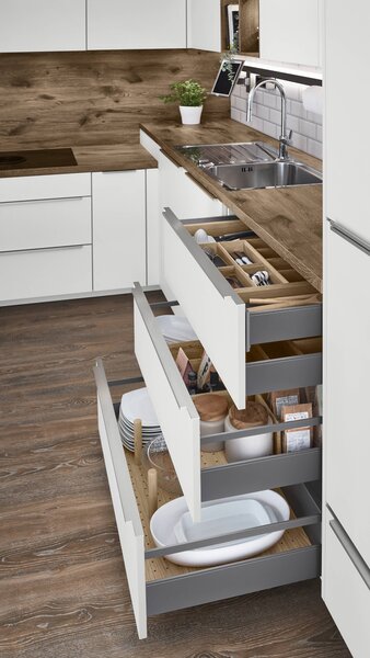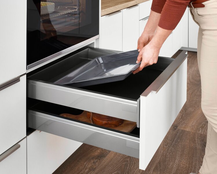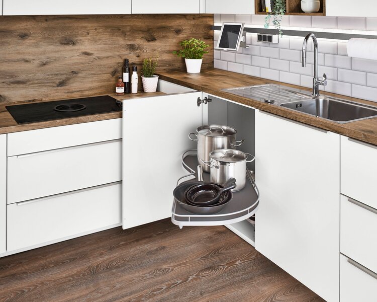 Eckunterschränke gelten oft als schwer nutzbar, doch mit herausziehbaren Tablarböden wird jeder Winkel optimal erschlossen. Diese praktischen Tablare bringen verborgene Ecken groß heraus und machen sie vollständig zugänglich. Mit einem leichten Zug lassen sich selbst die hintersten Bereiche mühelos erreichen. Diese Lösung schafft zusätzlichen Stauraum und sorgt für Ordnung und Übersicht in der Küche.