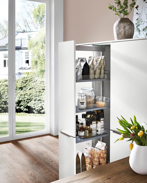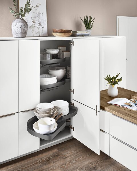 Ecklösungen sind nicht nur für Unterschränke eine clevere Wahl – auch Hochschränke profitieren von diesen durchdachten Systemen. Spezielle Tablarlösungen ermöglichen es, selbst in hohen Schränken jeden Winkel zu nutzen. So entsteht zusätzlicher Stauraum, der sonst ungenutzt bleiben würde, und die Küche wird noch funktionaler und effizienter gestaltet.