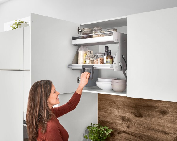 Auch die oberen Bereiche von Oberschränken müssen kein ungenutzter Raum bleiben. Mit ergonomischen Aufbewahrungssystemen lassen sich diese Höhen voll ausnutzen. Ein einfacher Handgriff genügt, und die oberen Fächer kommen nach unten, sodass alles bequem erreichbar ist. Diese innovative Technik macht den Alltag in der Küche komfortabler und hilft, den vorhandenen Stauraum optimal zu nutzen.