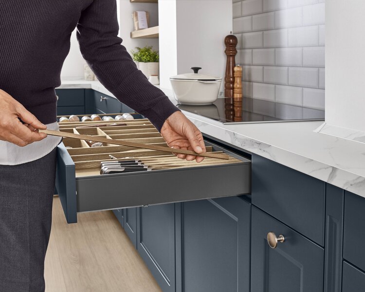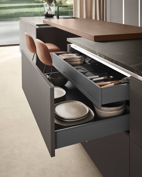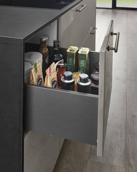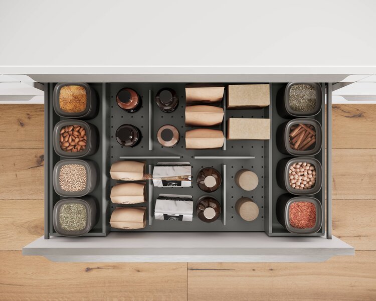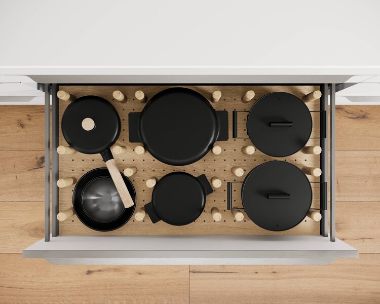 In der Aufbewahrungszone lagerst Du Geschirr, Besteck, Gläser, Kochutensilien und kleine Geräte. Diese Zone sollte in unmittelbarer Nähe zur Spülzone liegen, damit frisch gespültes Geschirr direkt eingeräumt werden kann.Teller, Schalen und Tassen werden heute nicht mehr mühsam in Oberschränken gestapelt, sondern komfortabel in kniehohen Schubladen mit Vollauszug untergebracht. Dort lassen sie sich leicht entnehmen, übersichtlich stapeln und sicher verstauen. Rutschfeste Einlagen und verstellbare Trennstäbe aus Holz oder Metall sorgen zusätzlich für Stabilität und Struktur.