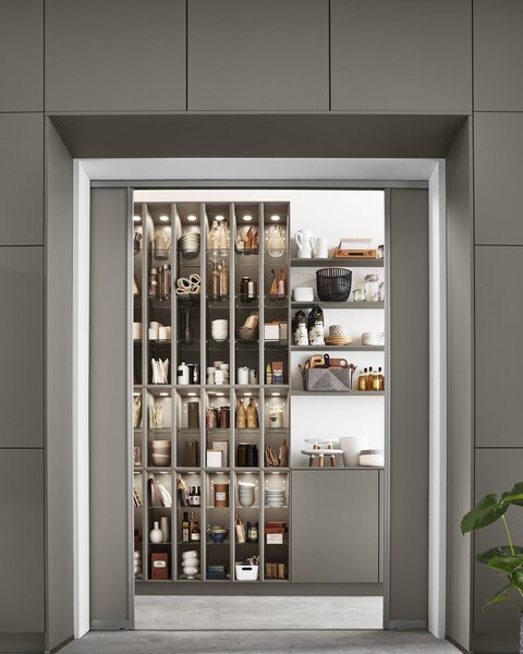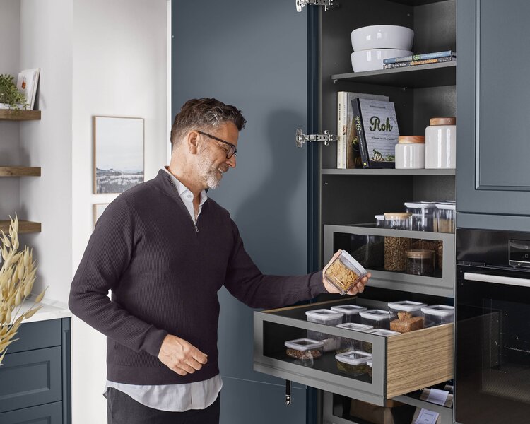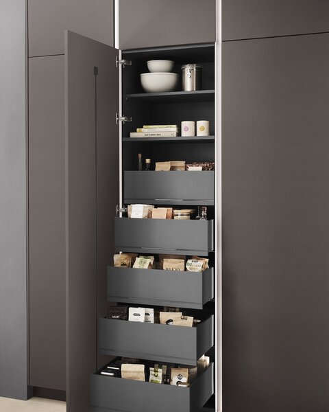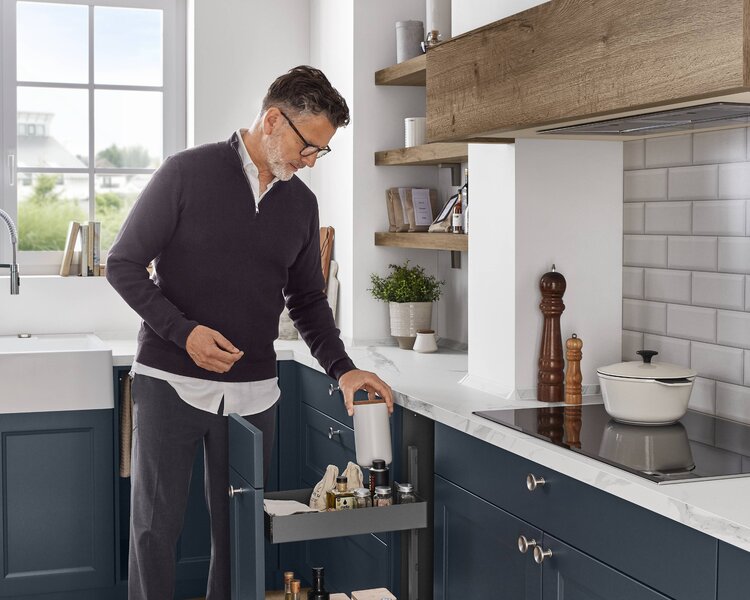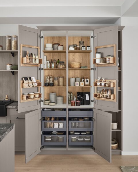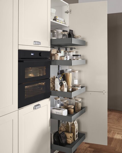 Flaschen und Gewürze finden dank cleverer Halterungen, Einschübe und Kästen im Inneren der Schränke ihren festen Platz und bleiben selbst beim Herausziehen stabil. Steht eine separate Speisekammer zur Verfügung, werden die Vorräte in der Regel dort gelagert. Ist das nicht der Fall, übernimmt ein geräumiger Hochschrank in der Küchenzeile die Funktion der Bevorratungszone.