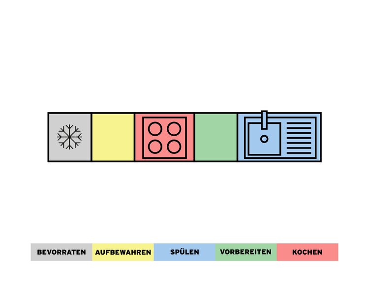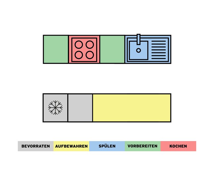 • Einzeilige Küchen: Alle Zonen – Bevorraten, Aufbewahren, Spülen, Vorbereiten und Kochen/Backen – sind hier entlang einer Wand angeordnet. Wichtig ist eine durchgehende Arbeitsfläche, damit Wege kurz bleiben und die Abläufe flüssig funktionieren. Vorräte lagern idealerweise an einem Ende, Spüle und Geschirrspüler in der Mitte, die Kochzone am anderen Ende.