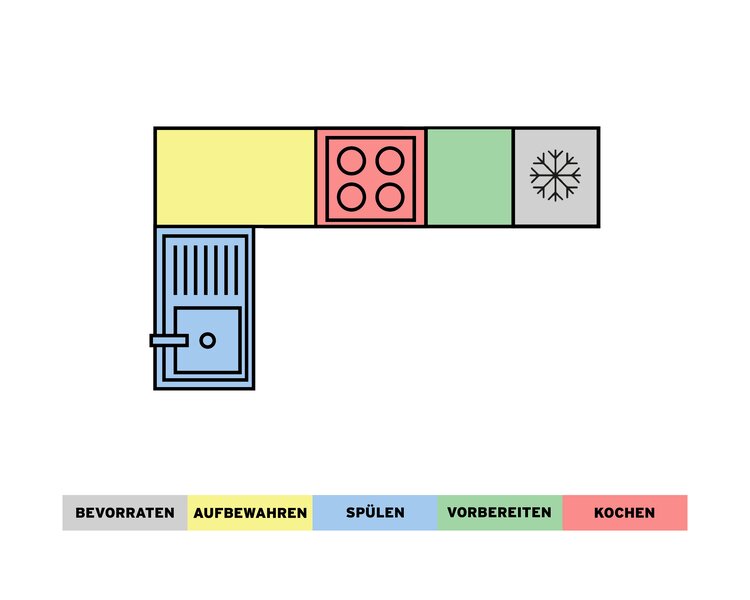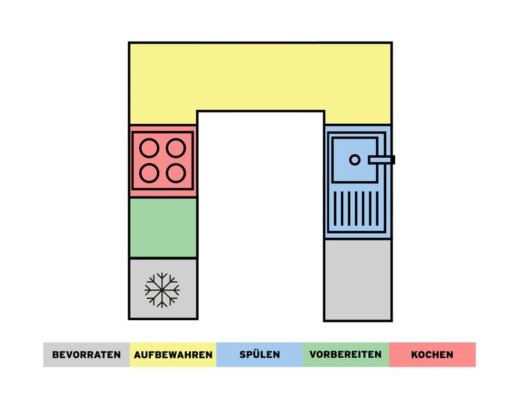 Die fünf Küchenzonen – Bevorraten, Aufbewahren, Spülen, Vorbereiten und Kochen/Backen – sollten in jeder modernen Küche ausgewogen vertreten sein. Je nach Küchenform – ob U-Form, L-Form, Inselküche oder ein- bzw. zweizeilige Küche – verschieben sich die Zonen in ihrer Anordnung, doch das zentrale Trio Spülen + Arbeiten + Kochen bleibt immer bestehen.
