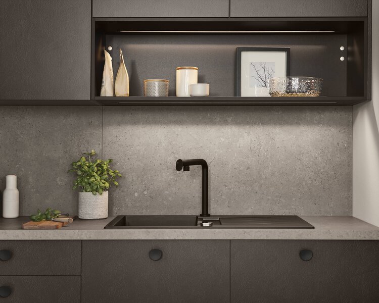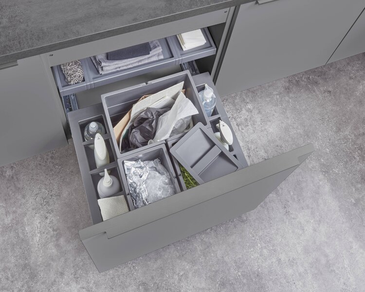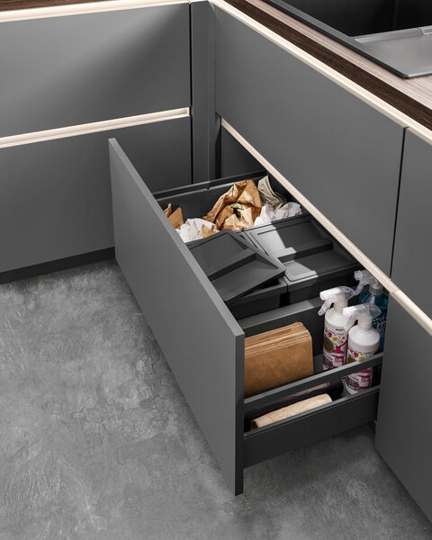 In der Küche übernimmt die Spülzone eine zentrale Rolle. Hier treffen Geschirrspüler, Spülbecken und Müll- und Recyclingsysteme aufeinander und bilden den Bereich, in dem täglich am meisten Bewegung herrscht.Unter der Spüle im Spülenunterschrank empfiehlt sich ein Vollauszug, in dem Spülmittel, Reiniger und Schwämme ordentlich und schnell zugänglich verstaut sind. So bleibt die Arbeitsfläche frei, und alles ist mit einem Handgriff zur Stelle.