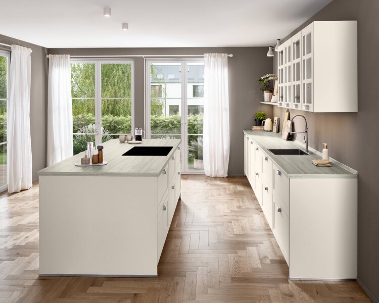 • L‑Küchen: Die Kochzone kann auf einem Schenkel liegen, Spüle und Vorbereitung auf dem anderen. Die Eckbereiche bieten Platz für Stauraum oder clever platzierte Vorratsschränke. Dieses Layout ist offen und übersichtlich, besonders für offene Wohnküchen geeignet.