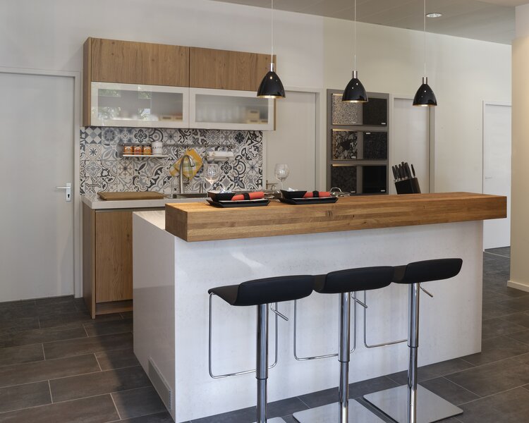 Sitzgelegenheit, Theke und Rückwand hinter dem Kochfeld aus Massivholz.