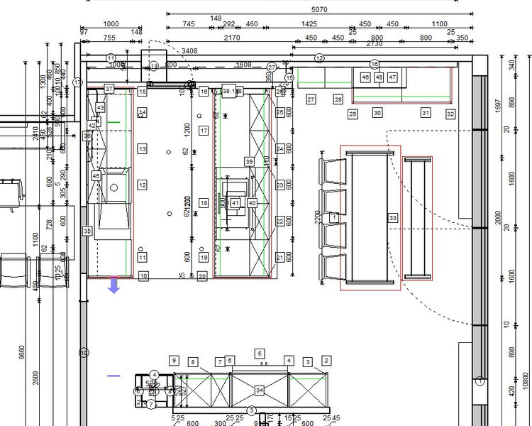 Die Arbeitsplatte der Kochinsel besteht aus Dekton, die Arbeitsplatte gegenüber aus massivem Granit mit 20mm Stärke und einer massiven Holztheke.