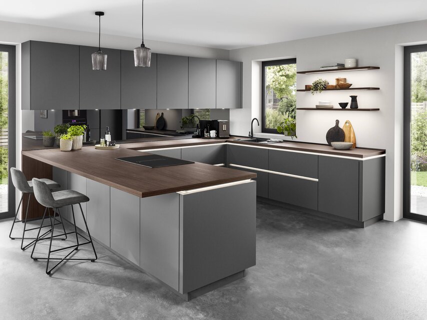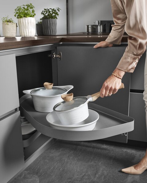 In einer Eckküche bieten Eckunterschränke besten Einblick und guten Zugriff. Durch die beidseitig aufklappbaren Türen sind sie ideal, um größere Küchenutensilien zu verstauen. Diese können mithilfe von Schwenkauszügen in Unterschränken zu wahren Stauraumwundern werden, sodass Du auch sperrige Utensilien wie Töpfe oder Bräter auf mehreren Ebenen einfach aufbewahren kannst.