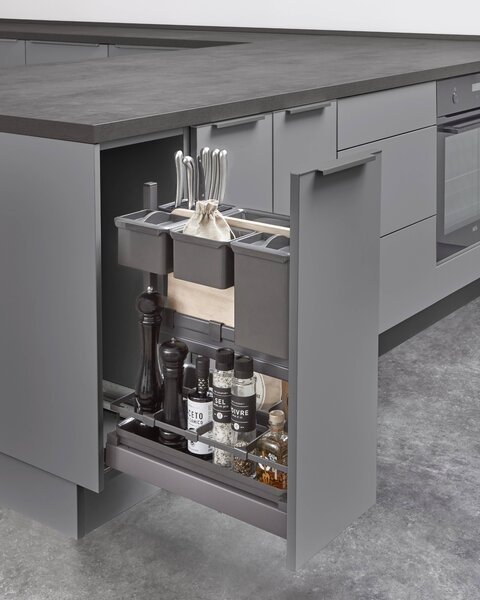 Mit Apothekerschränken ist alles übersichtlich verstaut. Dieses Auszugssystem nutzt den Platz ideal und ermöglicht bequemen Zugriff von beiden Seiten auf Utensilien und Lebensmittel. Stauraum, der rundum entgegenkommt.